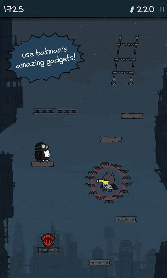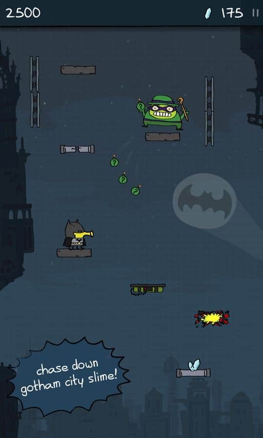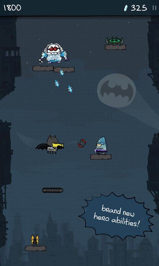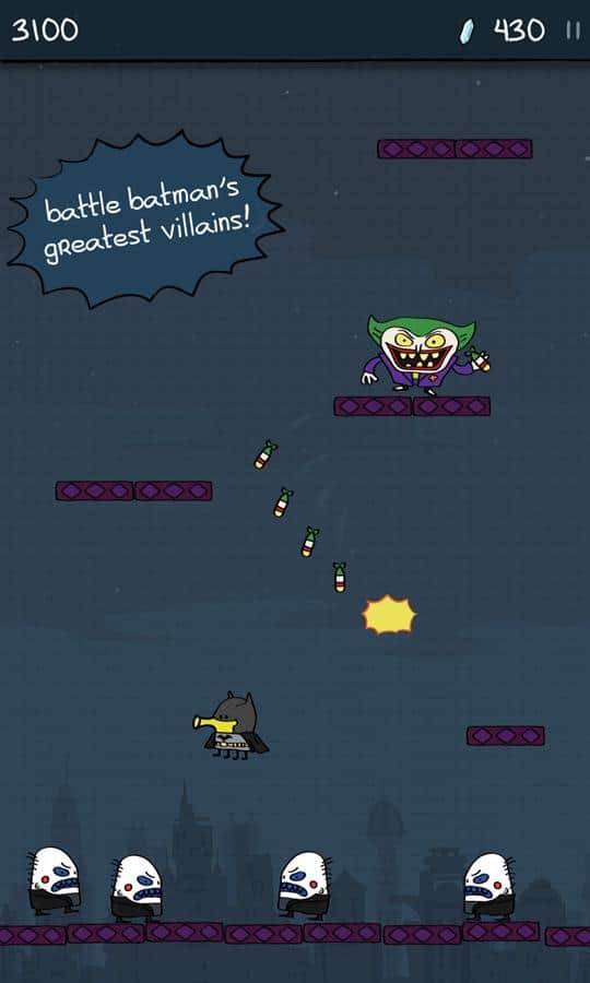 Doodle Jump DC - süper kahraman Batman'i yöneteceğiniz bir oyun. Platformlarda daha yükseğe zıplayın ve Gotham'ın ana kötüleri - Penguen, Bay Freeze, Joker ve The Riddler'a ulaşmaya çalışın. Gotham'ın tüm kötüleri bir araya geldi ve şehri yok edebilecek güçlü bir kristali çaldı. Göreviniz onları yakalamak ve güçlü silahlar ve ekipmanlar kullanarak yok etmek olacak. Kahramanınızı ekrana bir kez dokunarak kontrol edin ve kötüleri daha hızlı alt etmenize yardımcı olacak madeni paraları ve bonusları toplayın. Düşmanlarınıza meydan okuyun ve onlara neler yapabileceğinizi gösterin.