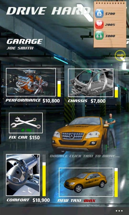 Drive Hard Taxi - Windows Phone için harika bir oyun, taksici olarak oynuyorsunuz, araba alıyorsunuz (hatta bizim 1970 model arabamız var), onu yükseltiyorsunuz, şehirde dolaşıyorsunuz, siparişler arıyorsunuz. Müşterileri istedikleri yere bırakıyorsunuz.