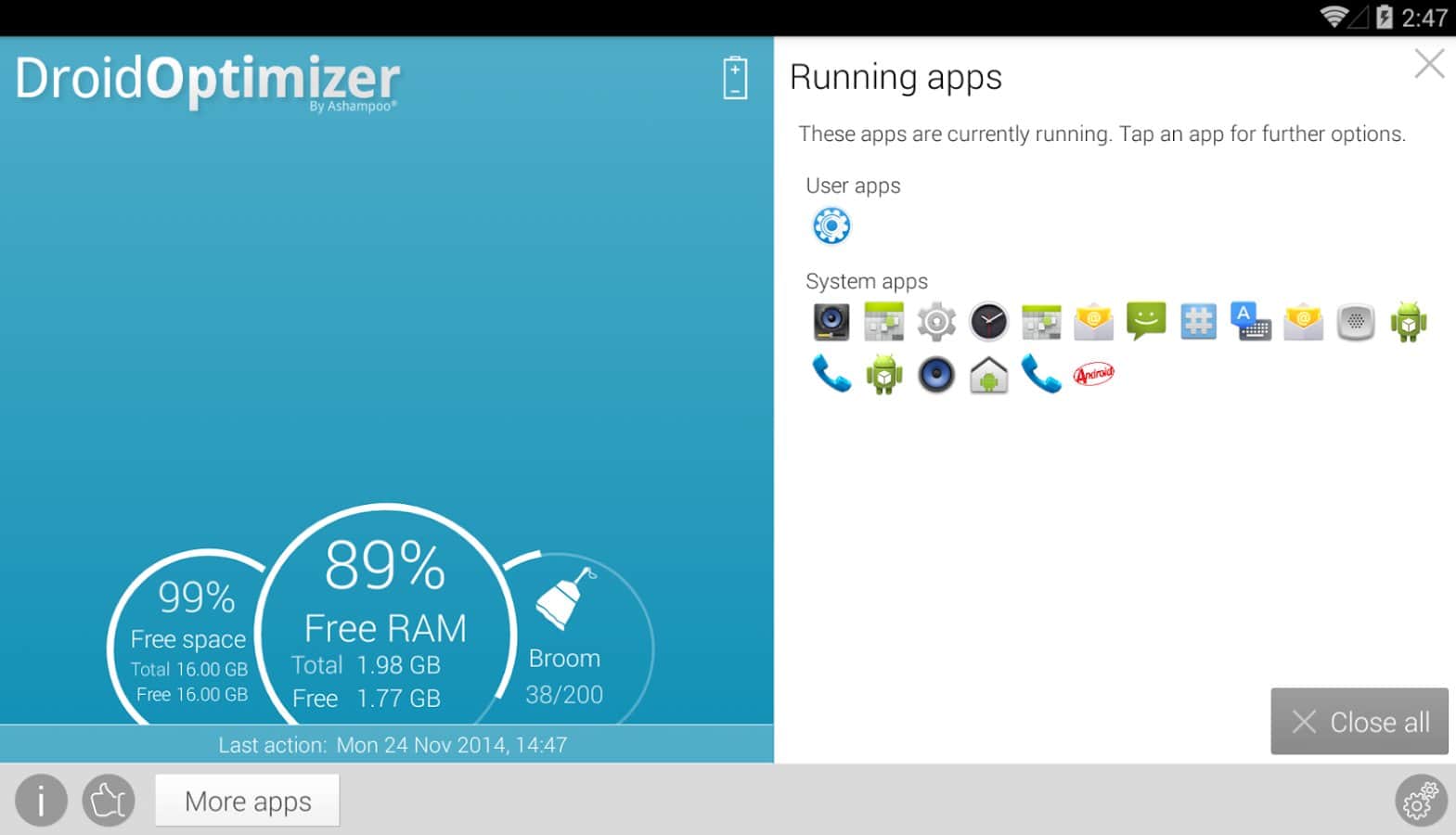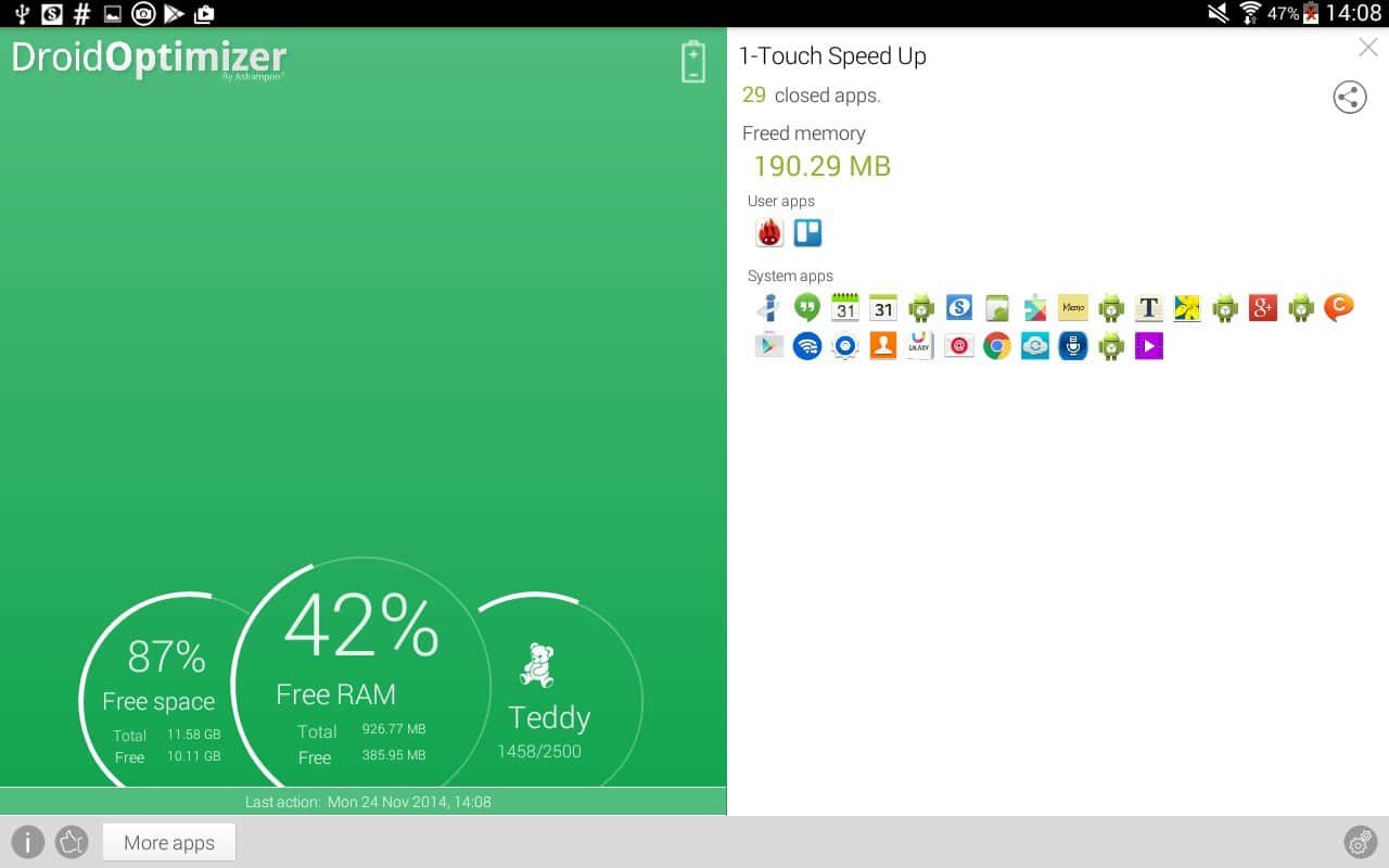 Bu sefer bize ne sunuyorlar? Program, arka plandaki uygulamaları otomatik veya manuel olarak kapatabilmekte, önbelleği temizleyebilmekte, çok büyük dosyaları arayabilmekte ve hatta sistem temizliği için tüm işlemleri belirli bir program dahilinde gerçekleştirebilmektedir. Güvenlik de unutulmamış: Droid Optimizer, tarayıcı geçmişini temizleyebilir ve kullanıcıya potansiyel olarak casus yazılımlar veya kritik izinler hakkında bilgi verebilir.