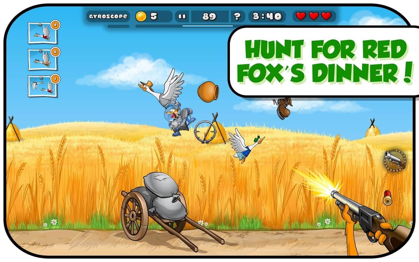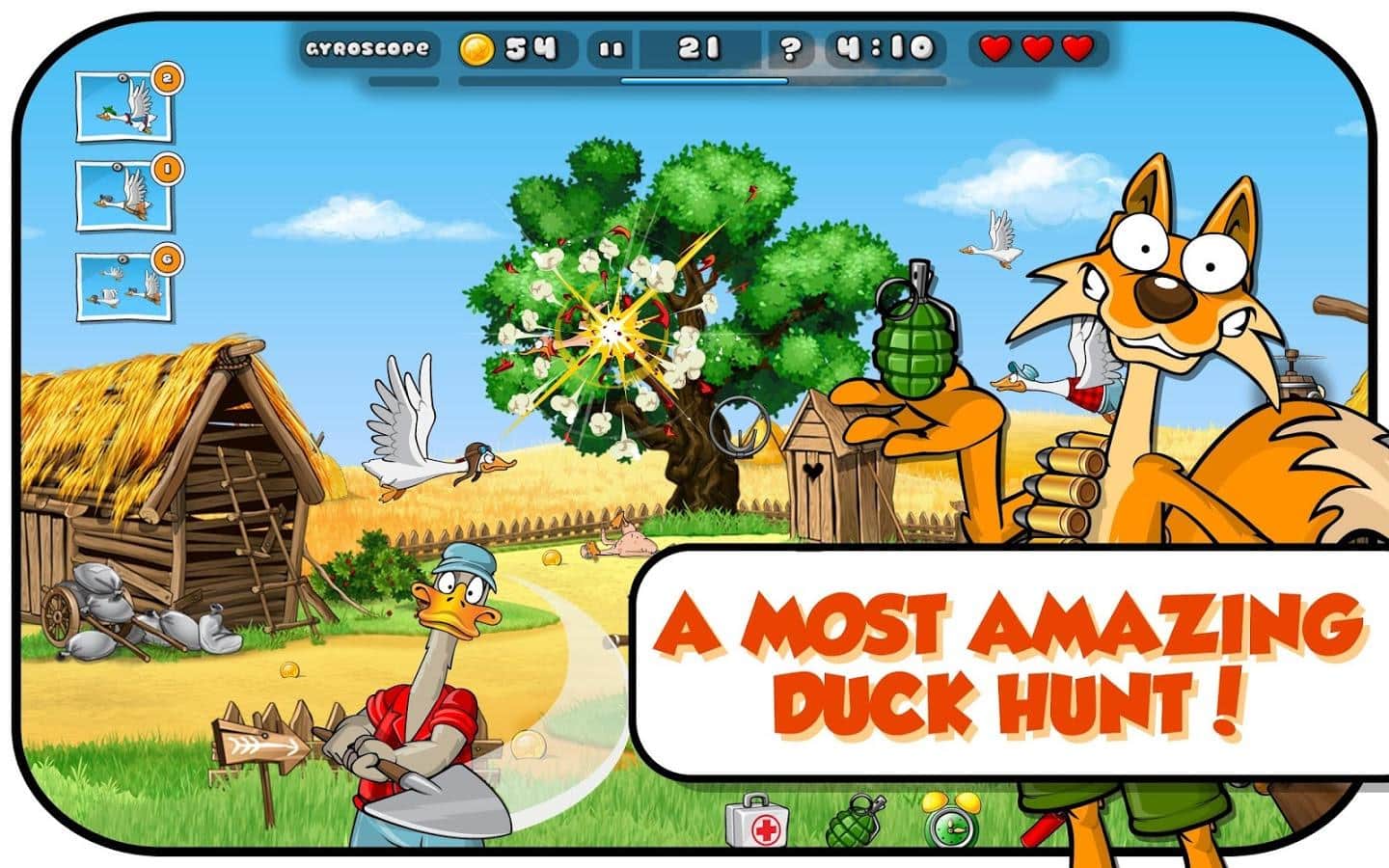 Ördek Yok Edici - Çok aç olduğunuzda, bir pompalı tüfek alırsınız ve akşam yemeği için bir şeyler avlamak istersiniz. Nişan alma yeteneğinizi kontrol edin, gökyüzünden ördek sürülerini düşürün. Tüfekler, makineli tüfekler, dinamitler - hepsi sizin besin elde etmek için arsenalinizde olacak. Eğlenceli Tilki'nin 50 seviyede ve 150'den fazla görevdeki macerasını takip edin. Dünyayı dolaşın, Kutup Bölgesi'ni ziyaret edin, eğlenceli silahlarla birlikte uzayda hayal kurun. Çizgi film grafikleri ve sesi sizi çok eğlendirecek.