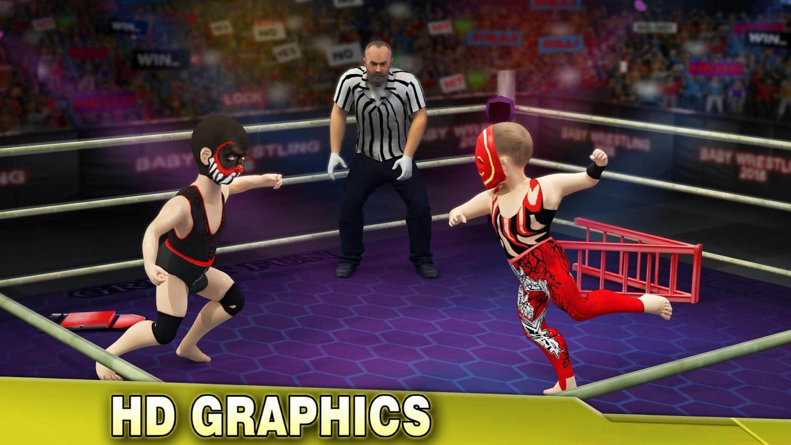Cüce Güreşi: Süper genç güreşçilere vur – Android için heyecan verici bir dövüş oyunu, burada kuralsız dövüşlere katılacaksınız. Bu oyunda güreş şampiyonunu kontrol altına alacak ve deneyimli rakiplere acı verici teknikler, darbeler ve yakalamalar uygulayarak meydan okuyacaksınız. Ringde çıkın ve en fazla puanı kazanarak göz alıcı dövüşlere katılın. Tüm rakiplerinizi yenin ve kahramanınızı geliştirerek onu yenilmez hale getirin. Ayrıca dövüş sırasında elinize geçen çeşitli nesneleri kullanarak darbe yapabilirsiniz. Rakibinizle dövüşün ve ona tekmeler, ağır darbeler, çeşitli teknikler uygulayın ve kombolar yapın.