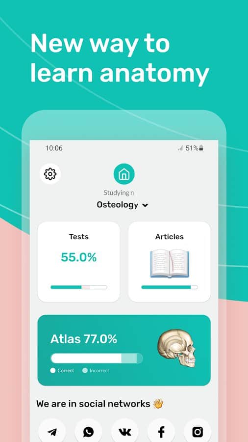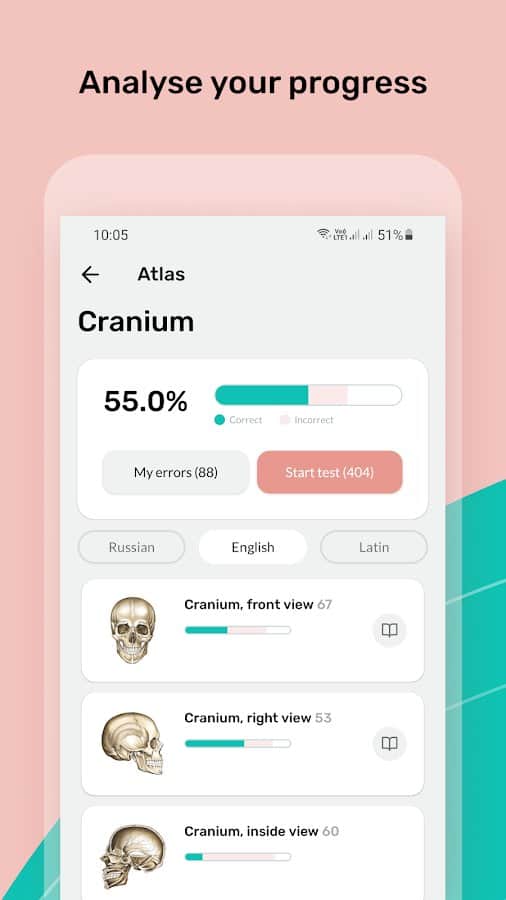 Kolay Anatomi - Anatomiyi etkili bir şekilde öğren - İnsan anatomisi sınavlarına hazırlan veya kendi bedeninle ilgili birçok faydalı bilgi edin! Bu uygulama, herkesin vücut bölümlerinin isimlerini, işlevlerini ve durumlarını öğrenmesine, öğrendiklerini test etmesine ve daha fazlasına olanak tanır, uzun notlar almaktansa. Temel bilgileri makaleler, görsel atlas, kartlar, testler ve notlar aracılığıyla aklınızda tutun. Uygulamada Rusça, İngilizce ve Latince dillerine erişim mevcuttur, bu da işi oldukça kolaylaştırır.
