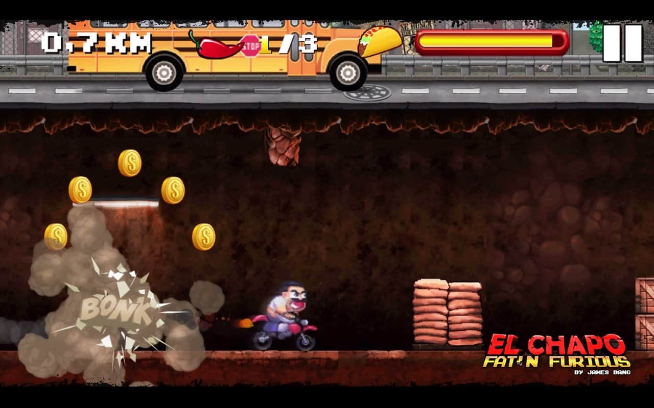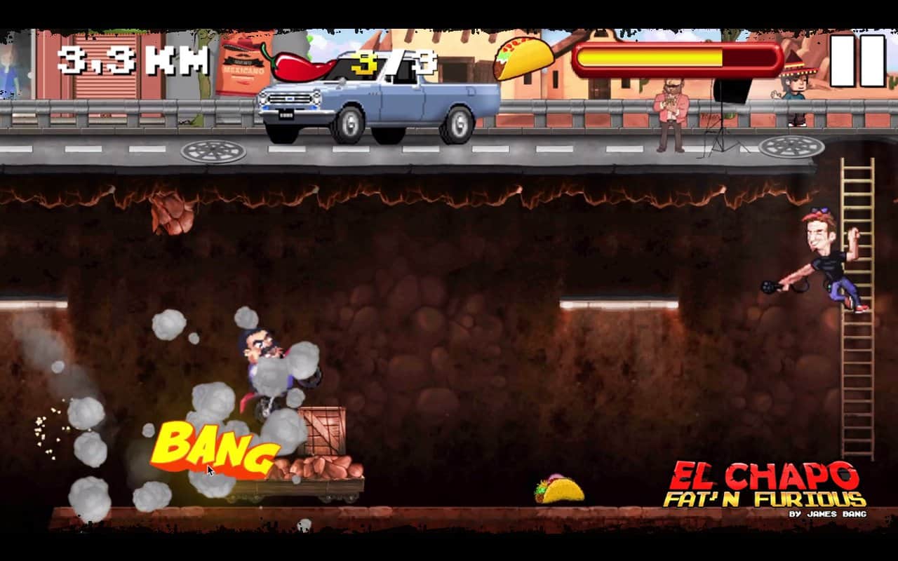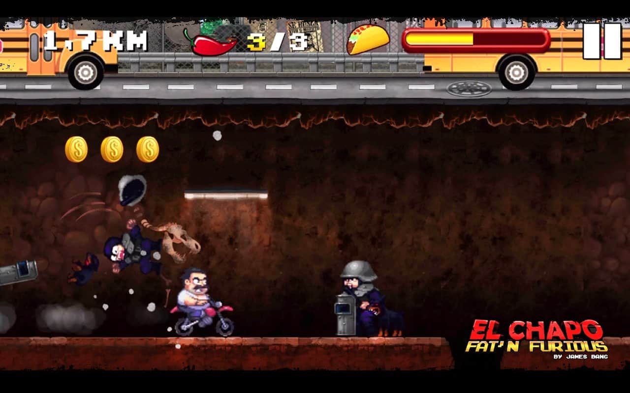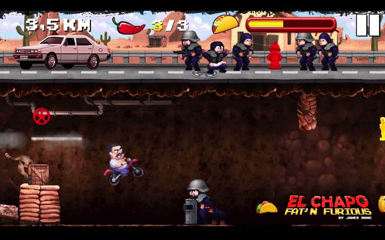 El Chapo - Şişman ve Öfkeli! - Bu, El Chapo adında bir şişman hakkında bir hikaye. Siz Meksikalı bir uyuşturucu baronusunuz ve polis tarafından yakalandınız. Ama paniklemediniz ve neredeyse hapse girecekken herkese orta parmağınızı gösterdiniz, yer altına düştünüz ve harika motorunuza atlayarak tüm hızınızla kaçtınız. Tünelden kaçarken dikkatli olun, çünkü orası tam da polisle ve çeşitli tuzaklarla dolu; bunları aşmak veya hızlanarak geçmek zorundasınız. Oyun, sadece iki düğme ile basit bir kontrol sunuyor: ileri hızlanma ve zıplama. Güzel 16-bit grafikler sizi 90'ların sonlarına geri götürecek ve ondan tam anlamıyla keyif alabileceksiniz.