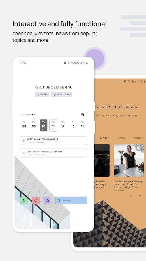 Elega KWGT – cihazının iç dekorasyonunu değiştirmek isteyenler için orijinal bir uygulama. Her gün gerekli olan tüm bilgileri sunar. Kullanıcı hava durumu tahminini, güncel haberleri ve günlük etkinlikleri öğrenebilir. Etkileşimli widget, herhangi bir masaüstünü süsleyecek. Uygulamada çeşitli duvar kağıtları seçilmiştir, gerekli renk ve stil bloklarını zahmetsizce ayarlamak mümkündür.