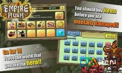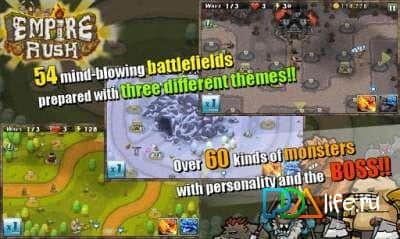 İmparatorluk Acele Android için. Harika bir Tower defense oyunu. Oyunda birçok seviye, 60 tür düşman, 3 farklı bölgede 54 lokasyon var. Kuleler inşa ediyoruz, silah satın alıyoruz ve düşmanları geçirmiyoruz.
