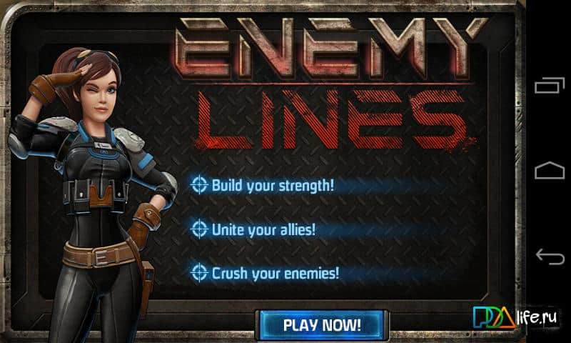 Düşman Hatları - Android için fütüristik bir çevrimiçi strateji oyunu, acımasız ve amansız savaşlarla dolu, burada savaşların ortasında kalıyorsunuz. Askeri gücünüzü artırın ve işgalcilere intikam alın! Ordunuzu geliştirin ve eğitin, üssünüzün topraklarını genişletin ve diğer oyunculara karşı gerçek zamanlı stratejide heyecan verici savaşlar yapın.