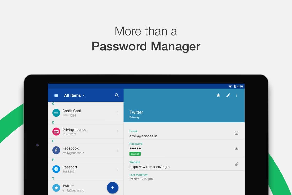 Enpass Şifre Yöneticisi - Android için en iyi şifre yöneticisidir. Enpass ile tüm şifrelerinizi güvenli bir yerde saklayabilirsiniz. Ayrıca, bu araç istediğiniz uzunlukta şifre oluşturmanıza da yardımcı olur. Otomatik doldurma özelliği sayesinde, şifreyi kopyalamadan ilgili alana yapıştırabilirsiniz. Enpass, bilgilerinizi kendi sunucularında saklamaz. Çalışmak için internete bile ihtiyaç duymaz. Ancak cihazlarınız arasında senkronizasyon yapabilmek için iCloud, Dropbox, Google Drive, OneDrive veya WebDAV sunucusunu bağlayabilirsiniz.