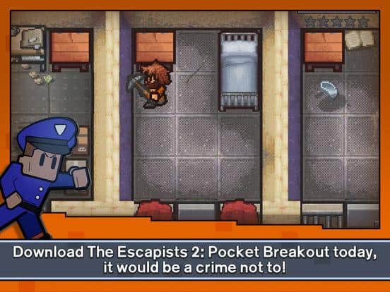 Escapists 2: Cepten Kaçış – IOS için bir simülatör, burada yine hapisten kaçacaksınız. Bu oyunda, hapis yatan bir mahkumu kontrol edeceksiniz ve yanılarınıza sahtekarları alarak kaçış yapmanız gerekecek. Kaçış planınızı dikkatlice düşünün, çatıyı, havalandırma sistemini ve hapishanenin bodrum katını keşfedin. Arkadaşlarınızdan oluşan ekibinizi oluşturun ve birlikte kaçışı gerçekleştirin. Kaçış için ihtiyaç duyduğunuz parçaları ve eşyaları satın alın ve değiş tokuş yapın, güvenlik güçleriyle savaşın.