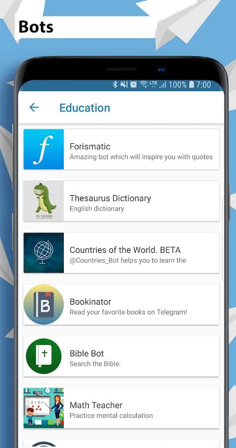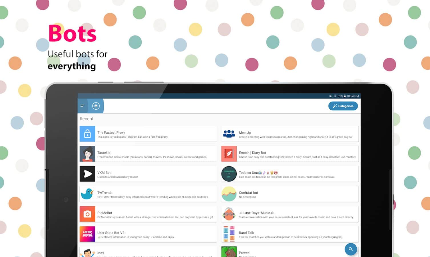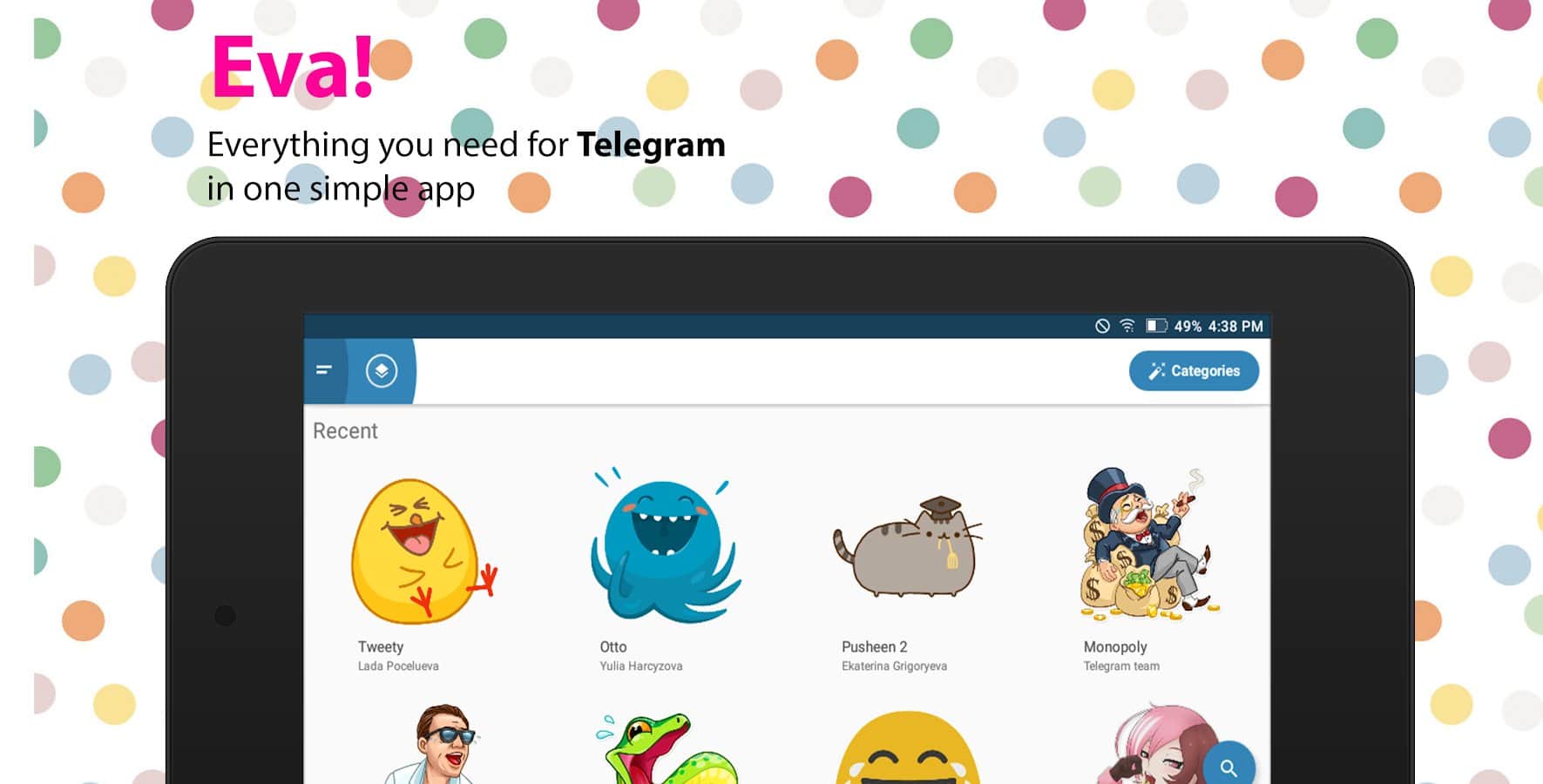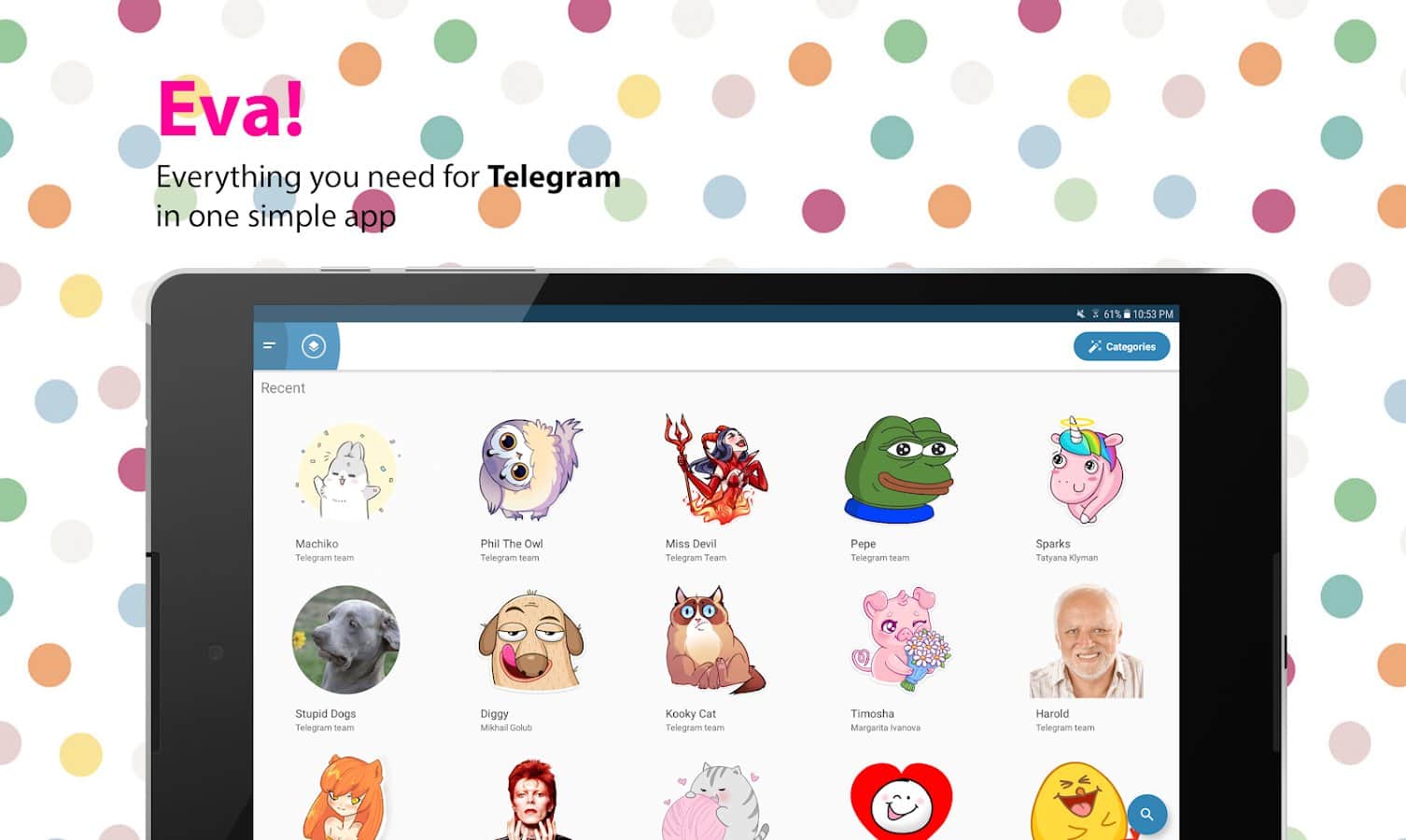 Eva: Telegram için Her Şey - Telegram istemciniz için gerekli ve faydalı bir şey bulamadığınız sık sık olur mu? Bu uygulama bu sorunu çözecek, çünkü içinde çıkartma paketleri, birçok popüler grup ve bir sürü bot barındırıyor. Botları kurmak veya ayarlamak artık çok daha kolay, hepsinin açıklaması var ve liste halinde sıralanıyor. Burada gereksiz hiçbir şey bulamayacaksınız, yalnızca en önemli ve gerekli olanlar.