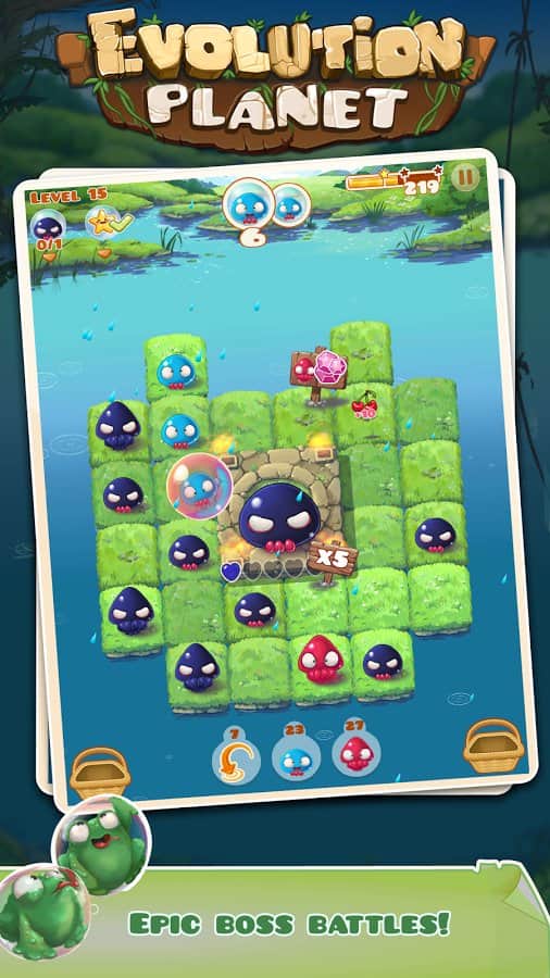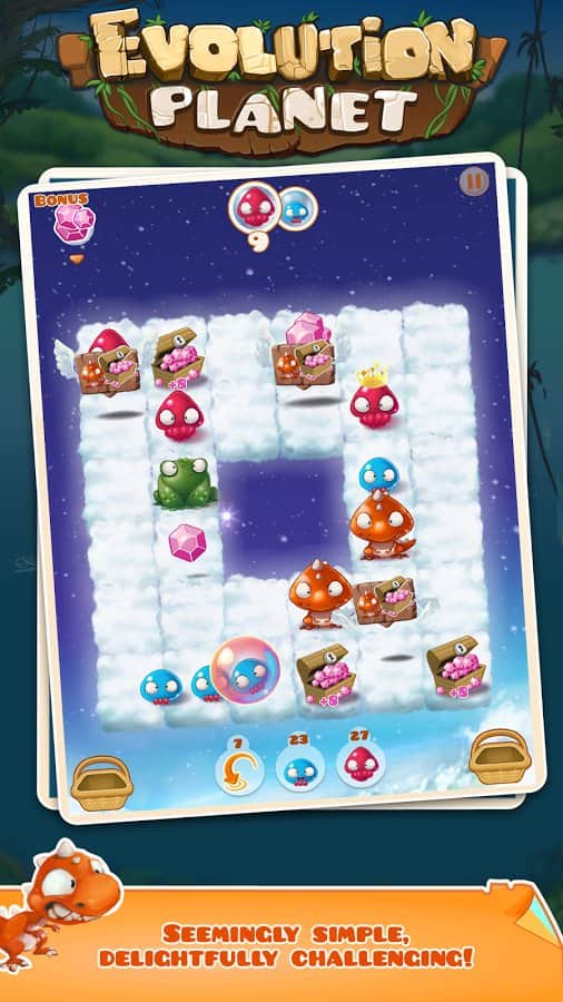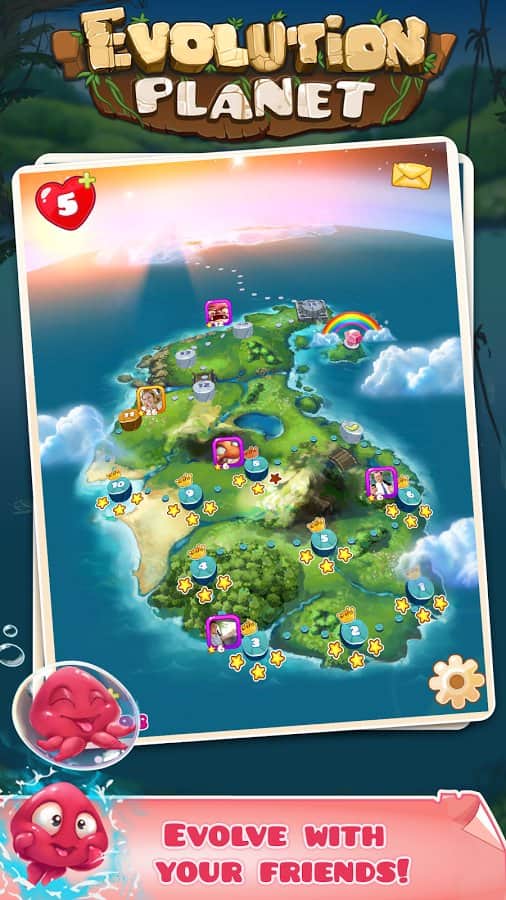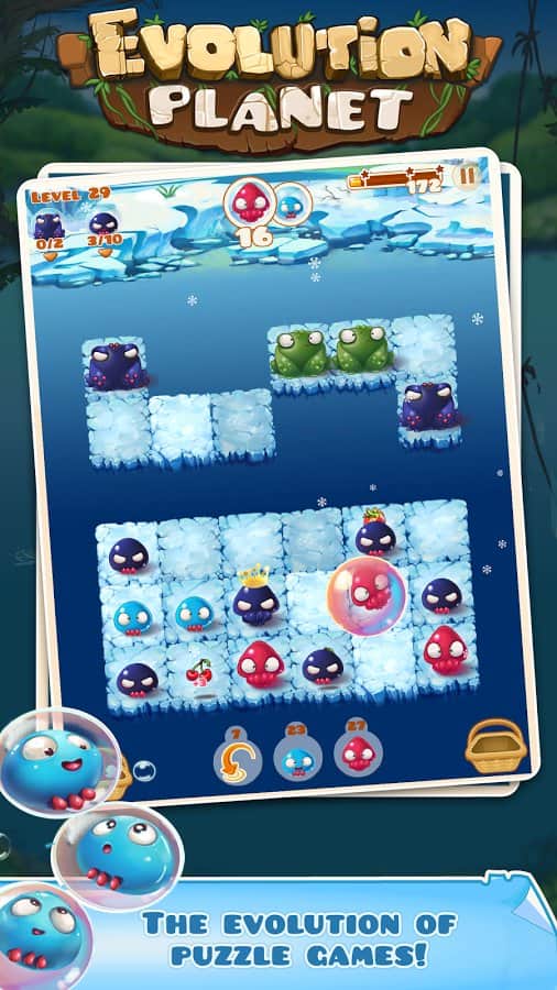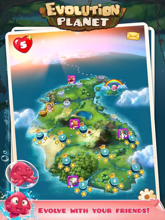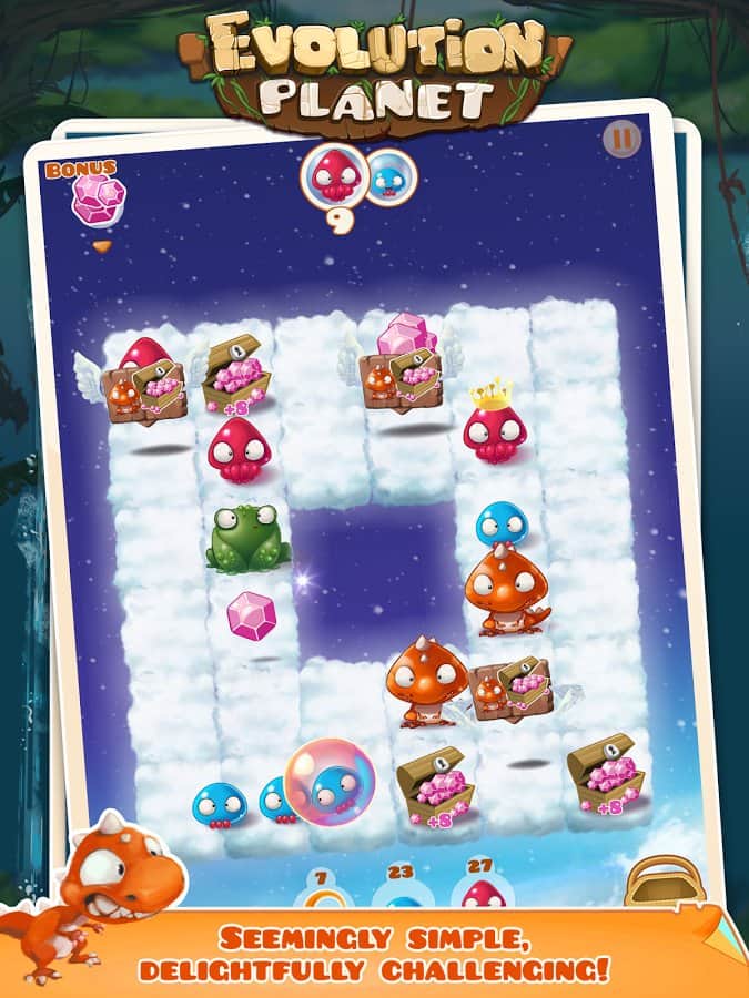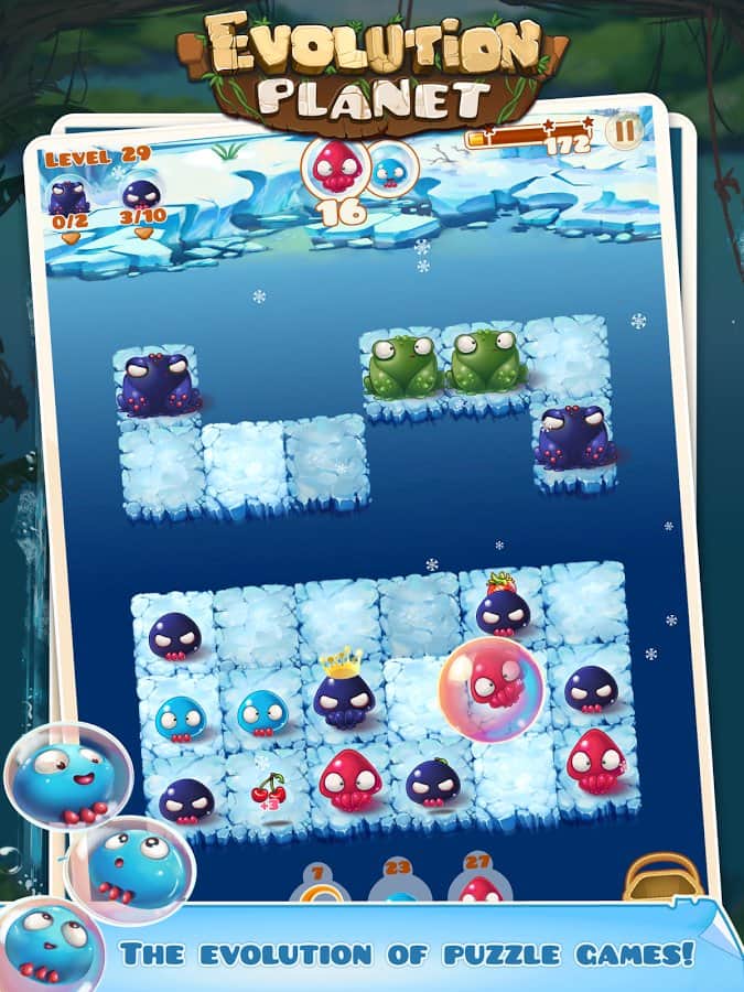 Evrim Gezegeni – oyun size unutulmaz bir sevinç hissi verecek. Nehirler ve bataklıkların neşeli sakinleriyle birlikte maceralara, hazine avına çıkın. Seviyeleri geçerken bir adadan diğerine geçiyoruz. Eğer aynı renkten üç nesneyi birleştirirsek, bunlar başka bir varlığa evrimleşir ve bu şekilde kurbağalara dönüşene kadar devam eder. Oyunda mevcut olan tüm varlık türlerini açın: üç amip – jelibona dönüşür, üç jelibon – kurbağaya dönüşür. Üç kurbağa … evrimleşir ve bu şekilde dinozor ortaya çıkana kadar devam eder. 6 muhteşem, rengarenk ada oyuncusunu bekliyor. Oyunda bosslar bulunmaktadır.