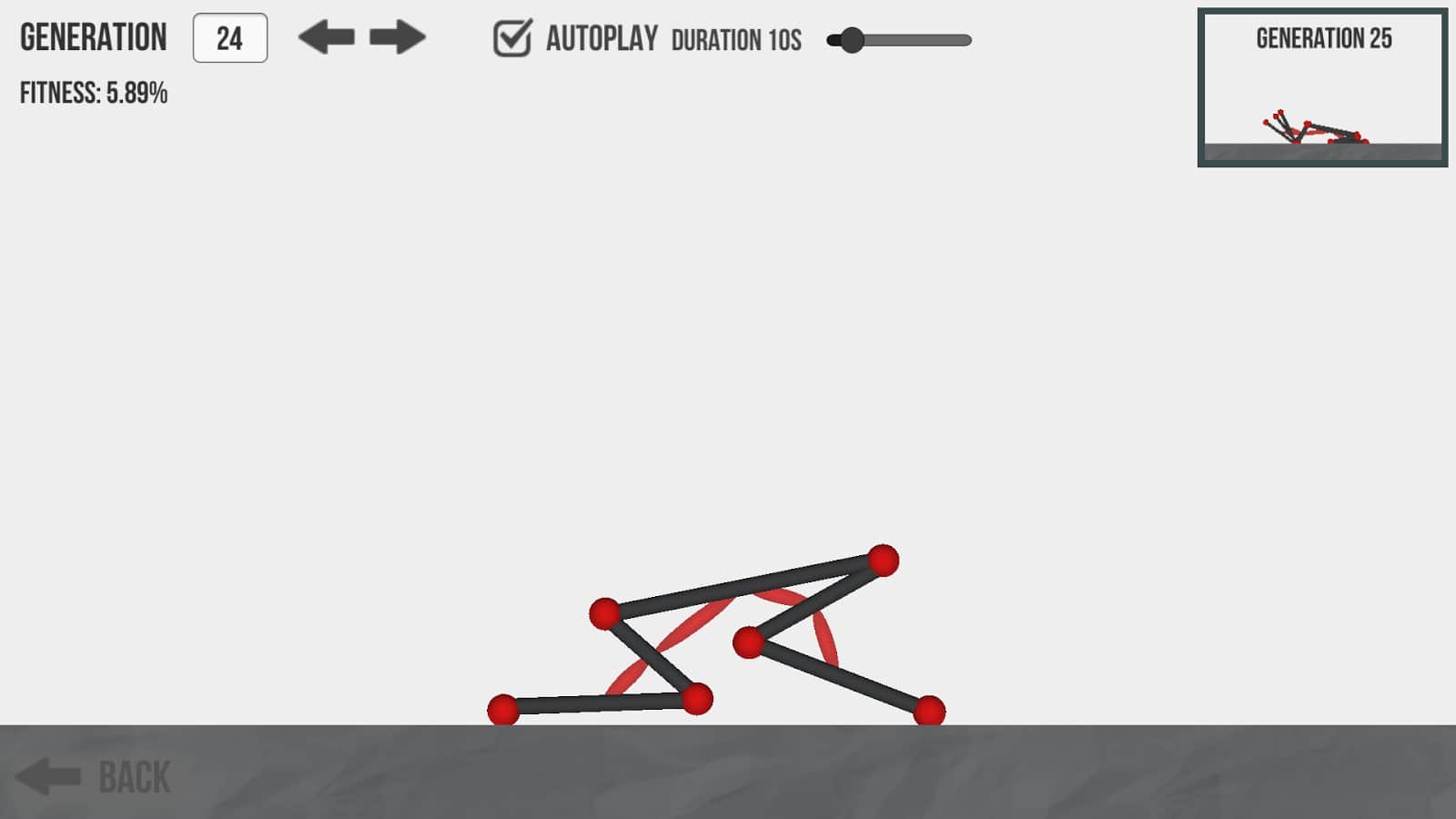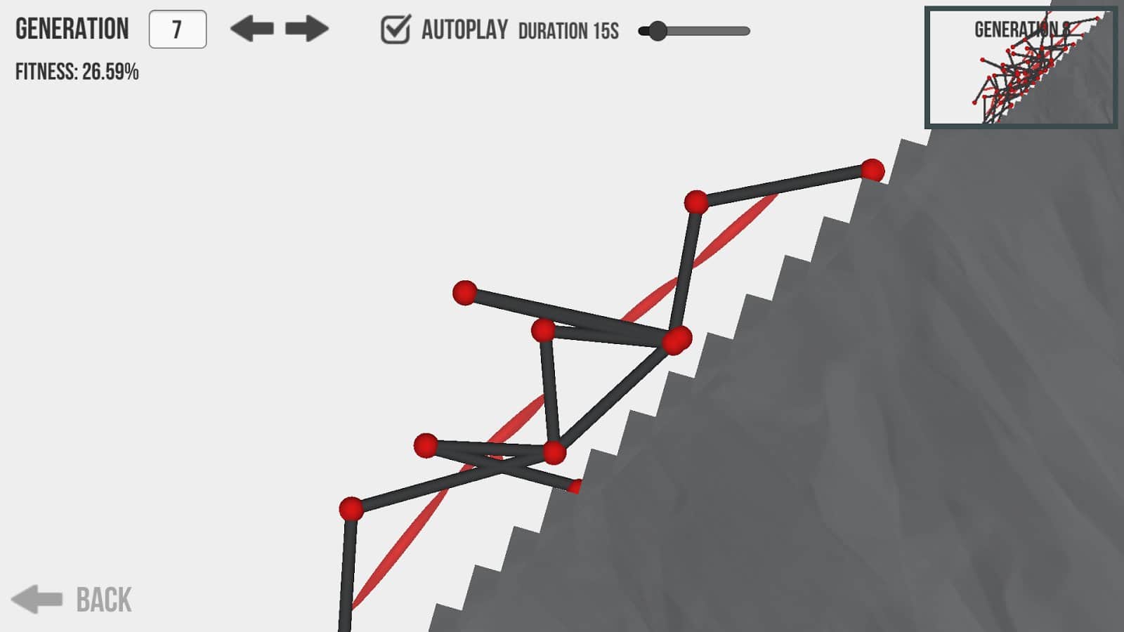 Evrim – Android için heyecan verici bir oyun, burada nöron bağlantılarını ve genetik algoritmaları birleştirerek çeşitli varlıklar yaratacaksınız. İnanılmaz varlıklar yaratmak için eklemleri, kemikleri ve kasları kullanın ve varlıklarınızı zıplamaya, farklı hareketler yapmaya ve duvara tırmanmaya zorlayın. Sınırsız hayal gücünüzü kullanın ve belirlenen görevleri yerine getirmek için inanılmaz varlıklar inşa edin. Eğer doğal seçilim, belirlenen görevleri çözme ve doğru çözümler bulma ile ilgileniyorsanız bu oyun sizin için yaratıldı. Arkadaşlarınızla oynayın ve onlara varlıklarınızı gösterin.