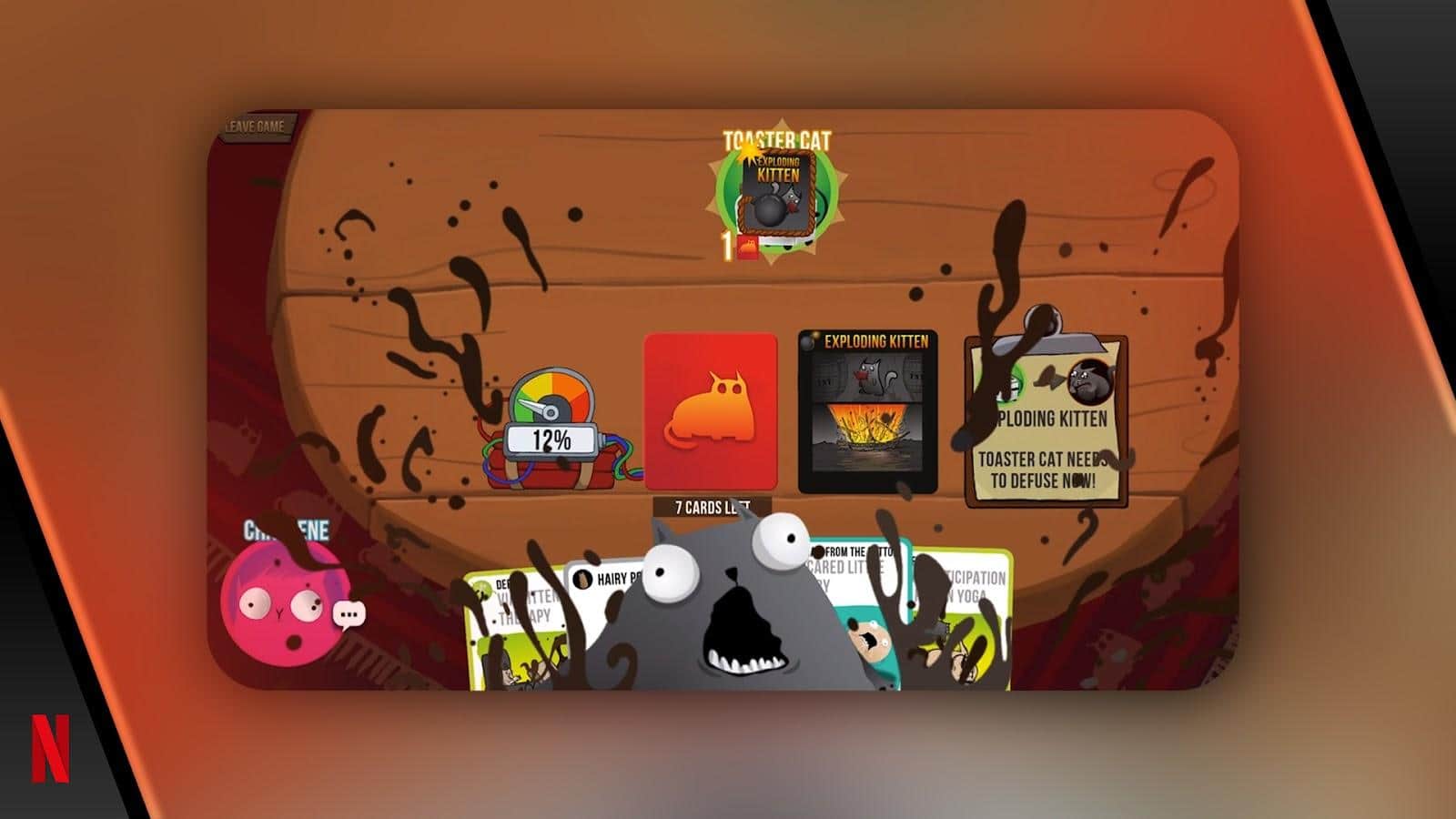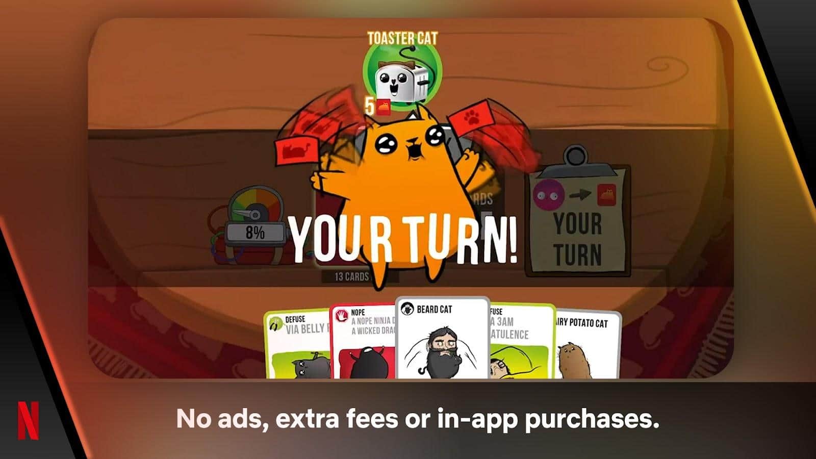 Oyun sırasında, patlayıcı kedilerin kurbanı olmamak için onlardan kaçınmalısınız! Bu oyunda kediler kontrol edilirken, oyuncular kart çekiyor ve bu, kimse patlayıcı kediyi eline alana kadar devam edecek. Eğer elinize bir etkisizleştirme kartı geçerse, patlamadan kurtulursunuz, aksi takdirde oyundan çıkarsınız. Koruma kartları, tüm rakipleri laser pointer ile besleyip dikkatini dağıtarak etkisiz hale getirmeye yardımcı olur. Destede, durumu kolaylaştırmak veya sorunlardan kaçınmak için kullanılabilecek başka kartlar da bulunmaktadır.