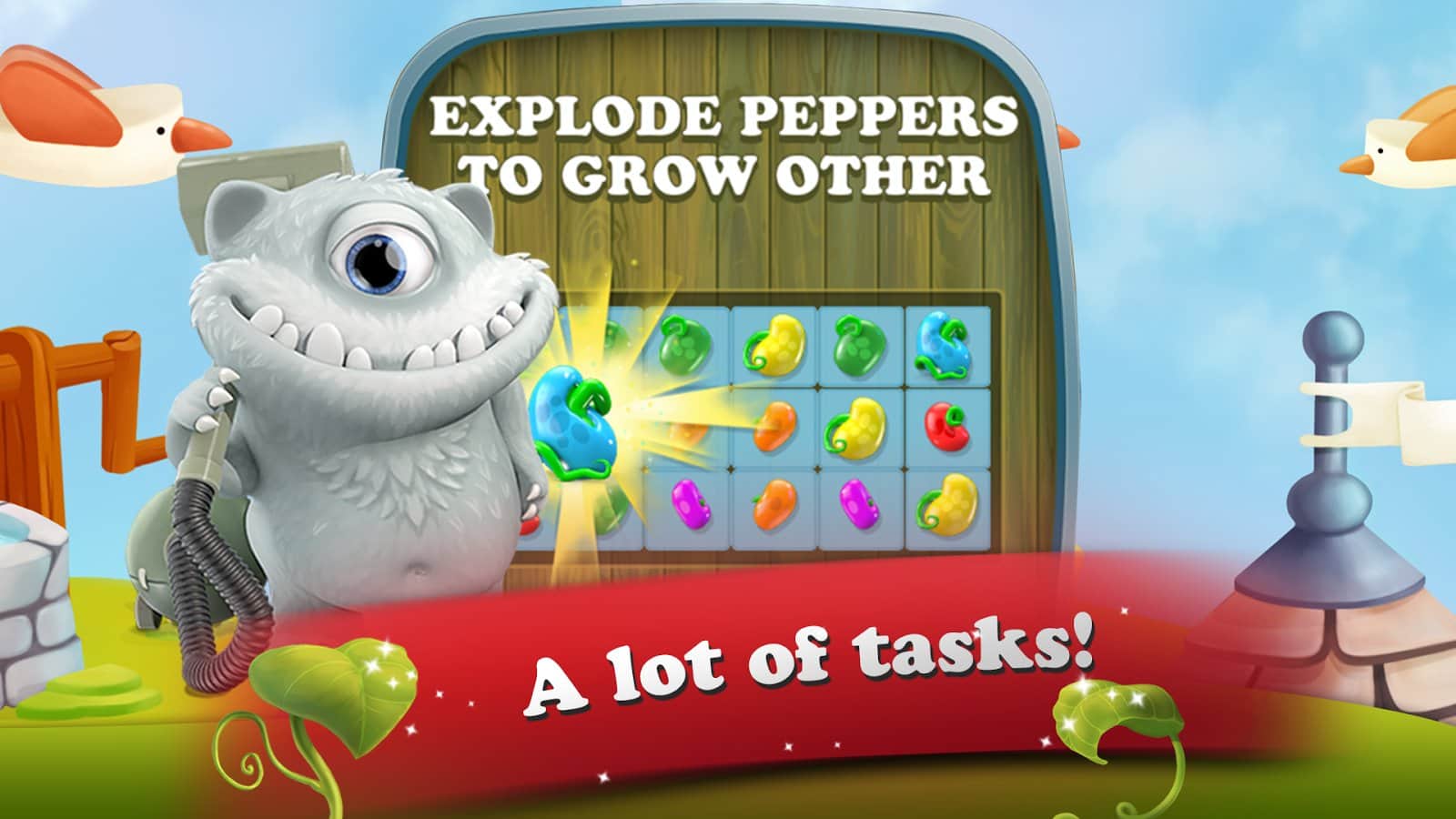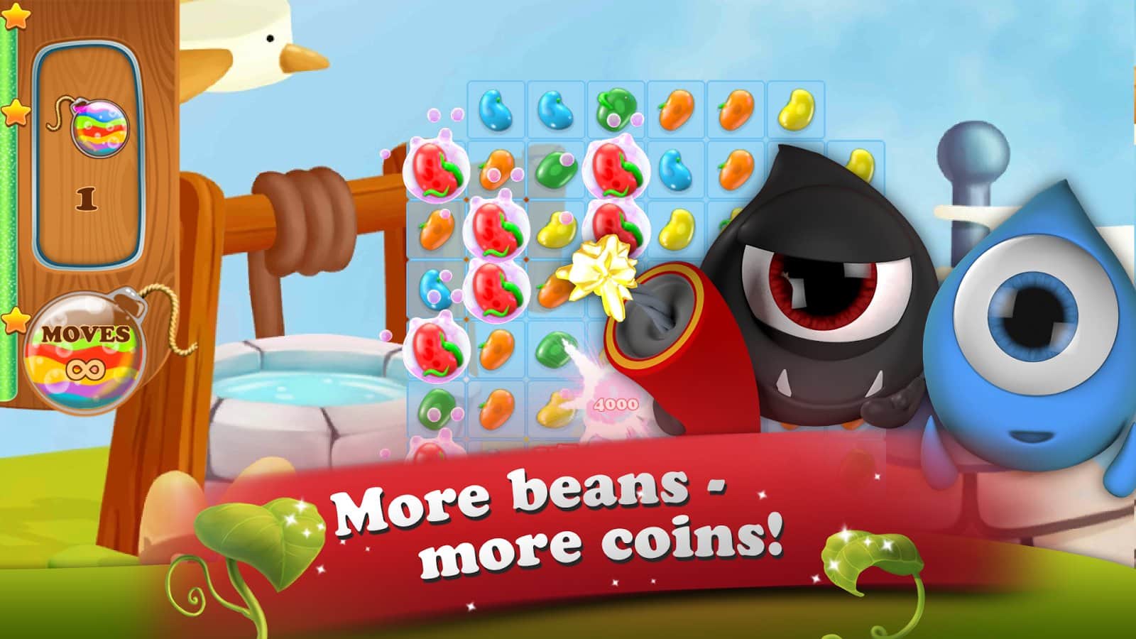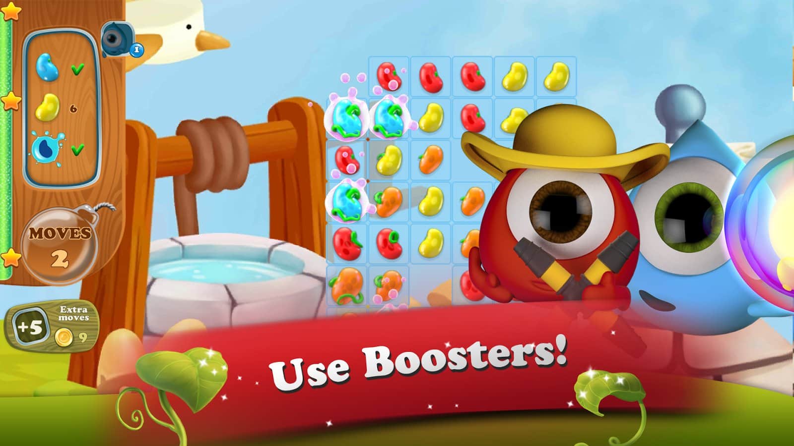 Masal Kahramanı: 3 Eşleştir Bulmaca - Android için bir oyun, üçlü eşleştirme türünde, burada şövalyeye kötü yetiniden prensesi kurtarmasında yardım edeceksiniz. Bu oyundaki ana göreviniz, mümkün olduğunca uzun fasulye sıraları oluşturmak ve fasulye sapında daha yükseğe tırmanarak yetinin kalesine ulaşmak ve onu yok etmek. Size verilen tüm görevleri ve misyonları yerine getirin ve tüm seviyeleri, bunu yaparken mümkün olduğunca az hamle kullanarak geçin. Bu oyunda tüm mantığınızı, zeka ve harika tepkilerinizi kullanarak çeşitli bonuslar kazanın. Mümkün olduğunca fazla fasulye patlatın ve prensesin yardımına koşun.