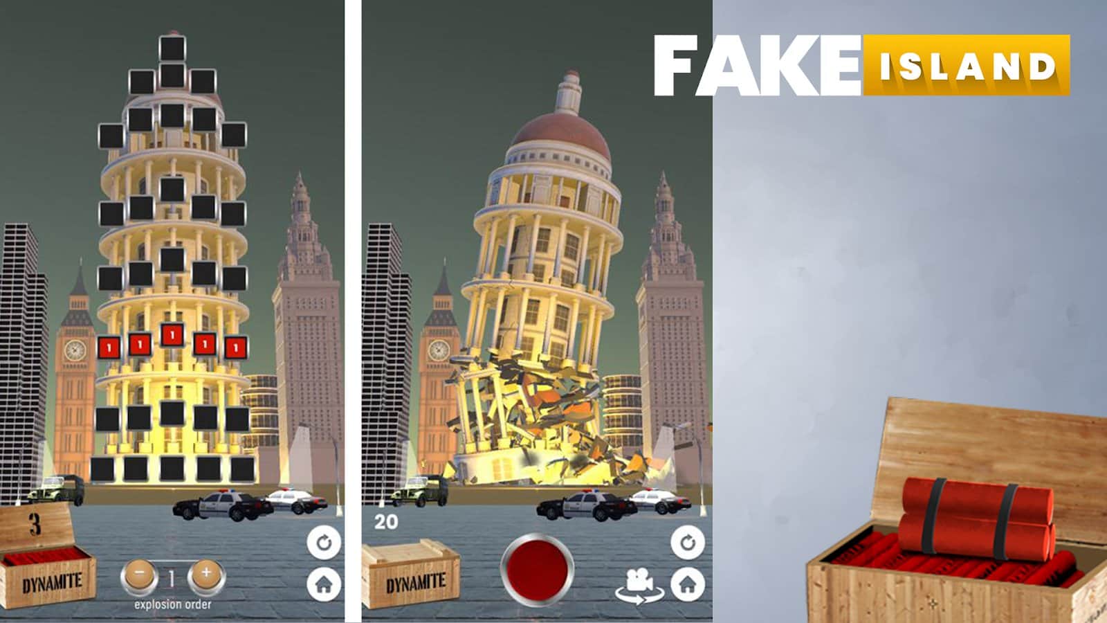 Sahte Ada: Yık! - Görünüşe göre, dünyadaki en popüler yerler, onları izlemek ve muhteşem yapılar etrafında vakit geçirmek için değil, fizik yasalarını keşfetmek için yaratılmış. Ana deney başlıyor! Yanınıza dinamit alın ve patlamalarla, küresel ölçekte yıkımlarla dünyayı fethetmeye gidin. Eyfel Kulesi'nden başlayın ve Özgürlük Anıtı ile bitirin, ziyaret ettiğiniz her anıt ülkeler için önemlidir. Kuralları kendi lehinize değiştirme zamanı, ne olursa olsun.