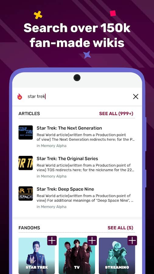 Fandom - kendi eğlence ve hayran deneyimleri evreniniz. Burada, en son haberlerden kısa incelemelere, filmlerden dizilere, video oyunlarından animeye kadar, sevdiğiniz içeriğin dünyasına dalmanız için gereken her şeyi bulacaksınız. Uygulama ile ilgi alanlarınıza uygun bir akış oluşturabilir, hayranlar tarafından oluşturulan wiki sayfalarında tartışmalara katılabilirsiniz. Sevdiğiniz fandomlarda 'OMG! anları' hakkında bildirimler alarak hiçbir detayı kaçırmayın. Düşüncelerinizi, hayran sanatınızı ve en son haberleri sosyal medyada paylaşarak tartışmalar ve sohbetler başlatın. Dünyanın en büyük hayran wiki platformunda, 40 milyondan fazla içerik sayfasıyla pop kültürü dünyasında olan her şeyden haberdar olun.