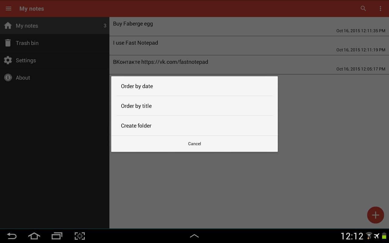 Hızlı not defteri - Bu uygulama, hayal edebileceğiniz en basit ve en hızlı not defteridir. Burada gereksiz hiçbir şey yok. Tüm notlarınız telefonun hafızasında kalır ve ne zaman yaptığınıza dair tarih ve saat belirtilir. Notları tarihe veya başlığa göre sıralayabilirsiniz. Ya da not grupları oluşturup bunları ayrı bir klasöre taşıyabilirsiniz. Ayrıca, yazı tipi boyutunu ve notlarınızın saklanma yerini değiştirebilirsiniz. Ayrıca şifreleme yöntemini ve not defterinizin görünümünü değiştirebilirsiniz. Genel olarak, bu, reklam ve diğer işlevlerin bulunmadığı basit bir not defteridir.