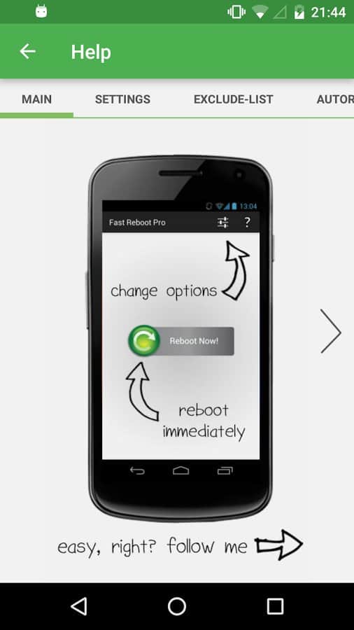Hızlı Yeniden Başlat Pro - Akıllı telefonunuzun her zaman maksimum performansla çalışmasını ister misiniz? Zamanla, akıllı telefonun süreçleri dolduğunda, daha fazla batarya ve bellek tüketmeye başlar. İşte bu yüzden bu uygulama icat edilmiştir. Çok önemli ve çok basit bir işlevi yerine getirir. Yani akıllı telefonunuzu veya şu anda çalışan uygulamaları yeniden başlatabilir, böylece daha az bellek tüketmeye başlarlar.