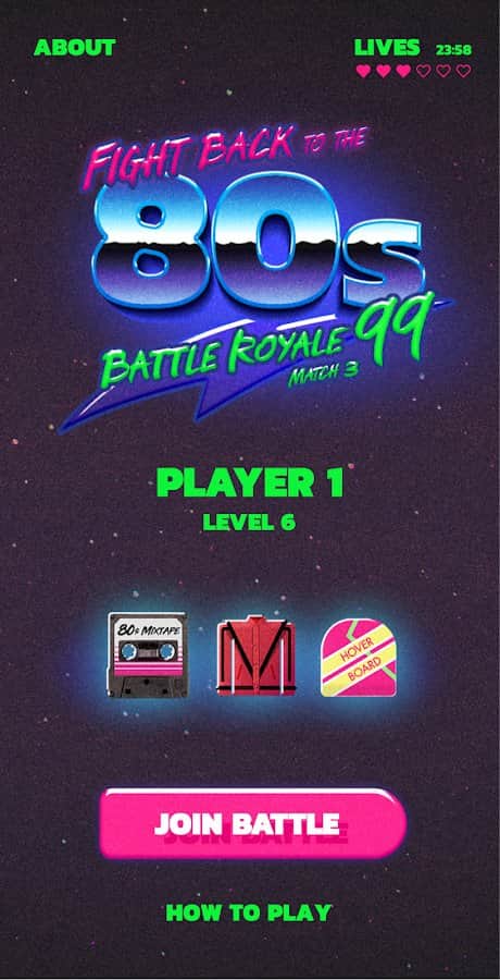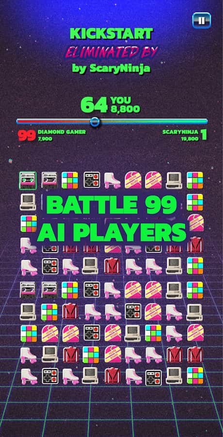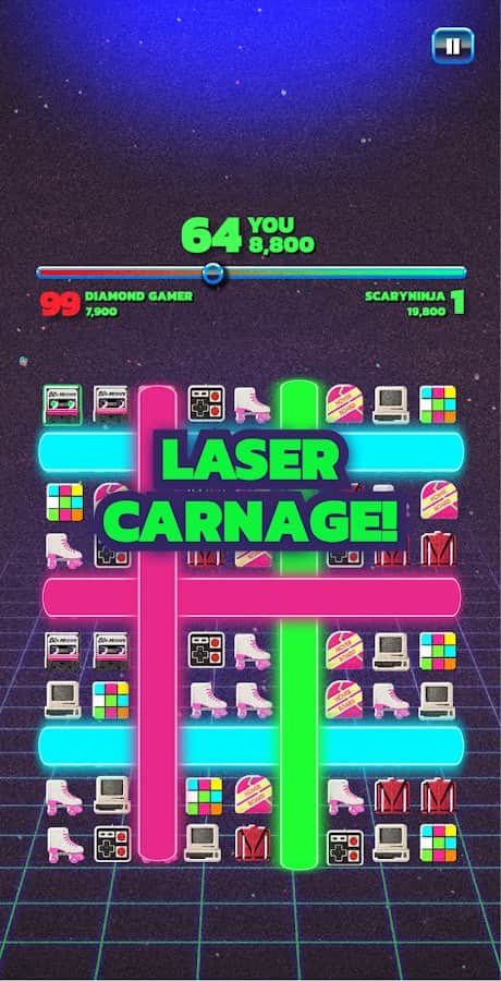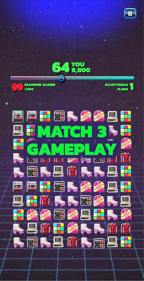 80'lere Geri Dönüş - 3 Eşleşme Savaş Royale – Android için ilginç bir üçlü eşleştirme oyunu, burada 80'lerin dönemine dalacaksınız. Bu oyun, oyuncuları unutulmaz ve benzersiz bir 80'ler atmosferi ile mutlu edecek; burada aynı nesnelerden oluşan sıralar oluşturacak ve bunları patlatarak oyun alanını temizleyeceksiniz. Zeka ve harika tepki sürenize güvenin ve çeşitli nesnelerin bulunduğu alanda ihtiyaç duyduğunuz nesneleri bulun. Parlak lazerlerin nesneleri yok ederken nasıl yanıp sönüşünü izleyin ve patlamaların zincirleme reaksiyonunu başlatın. Oyun, klasik oyun mekaniği ile heyecan verici bir oyun süreci ve unutulmaz bir deneyim sunacak. Bonusları keşfedin ve diğer oyuncuların rekorlarını kırın.