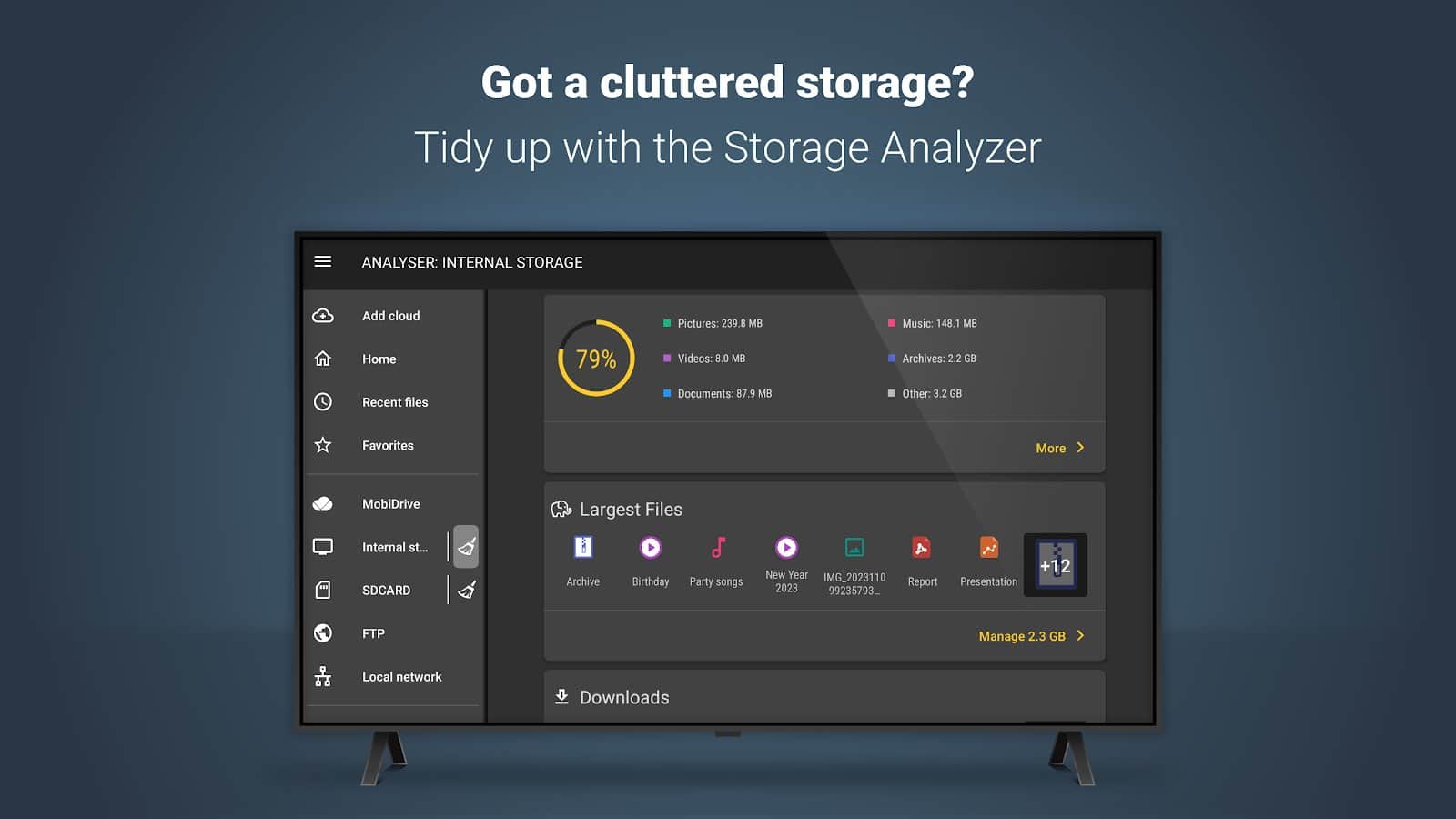 File Commander - Dosya Yöneticisi - En iyi dosya yöneticilerinden biri olarak haklı bir şekilde anılan kullanışlı bir uygulama. Bu uygulamanın kalitesinin doğrudan bir kanıtı, milyonlarca insanın onu indirmiş olması! Sayısız olumlu yorum ve değerlendirme mevcut. Boşuna değil, oldukça basit, çok işlevli ve kullanışlı. Menüye girdiğinizde, tüm dosyalarınızın yer alacağı kategoriler hemen size sunuluyor. Ayrıca, şu anda hangi dosyaların indirildiğini, akıllı telefonunuzda ne kadar bellek kaldığını ve hangi dosyaların en son açıldığını görebilirsiniz. Bu uygulama sayesinde FTP sunucularına bağlanabilir ve PC’nizle veri alışverişi yapabilirsiniz.