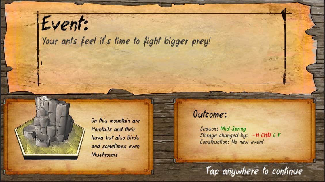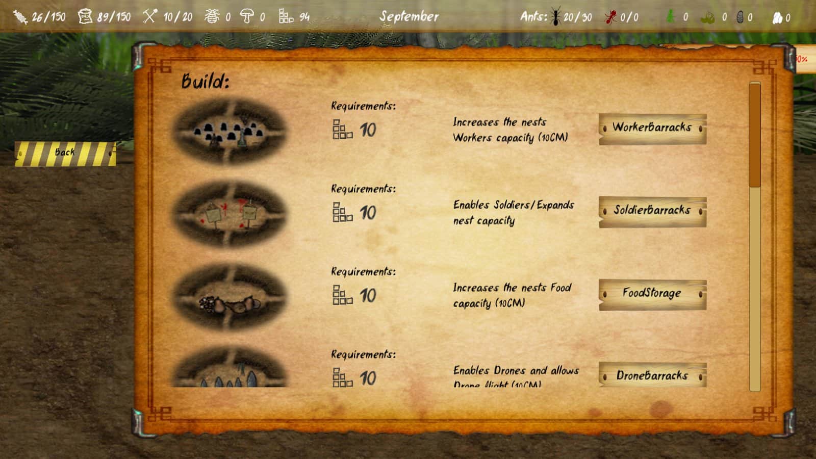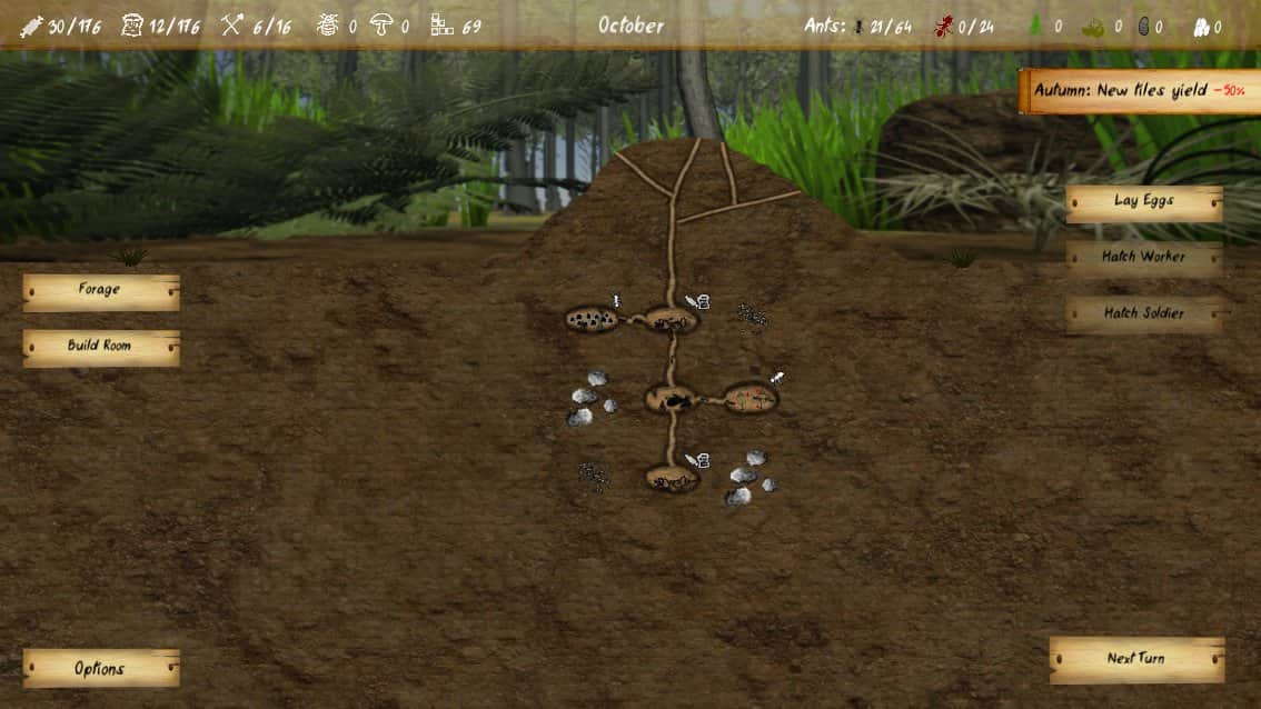 Sonunda Karıncalar - simülasyon, strateji ve rol yapma oyunları arasında bir şeyler sunan bir oyun ve şimdi geliştiricilerin bu türleri tek bir projede nasıl birleştirdiğini anlayacaksınız. Yani, karınca yuvasının inşasını kontrol altına almanız gerekecek, çeşitli böcek türleri ve farklı odalar inşa etme imkanı gibi birçok seçeneğiniz olacak. Bununla birlikte, yeterli savunma ve koruma sistemi oluşturmanız gerektiğini unutmamalısınız, çünkü bir ev inşa etmenin yanı sıra, kraliçeyi korumak da bir hedefdir. Çevredeki dünyayı keşfetmek de sizin görevleriniz arasında, bu yüzden seyahatlere hazırlanın. Diğer bir deyişle, karınca yuvası, karınca ve bu şaşırtıcı böceklerin yaşamı üzerine bir simülatörle karşı karşıyayız.