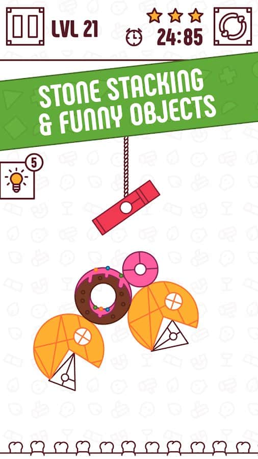 Dengeyi Bul - Fiziksel Komik Nesne Bulmacası – Android için heyecan verici bir bulmaca oyunu, burada çeşitli nesnelerden bir kule inşa edeceksiniz. Farklı nesneler ip ile bağlanacak ve aşağı düşecektir, sizin görev yours, bunları keserek kule inşa etmek ve dengeyi sağlamak için yerleştirmektir. Nesneleri farklı bir sırayla yerleştirin ve dengede tutun, onları kontrolsüz bir şekilde düşürmeden. Harika tepkinizi ve zekanızı geliştirin, oyunun 100 seviyesini geçin. Oyunda klasik, yıldızlar, sonsuz ve noel gibi 4 mod bulunmaktadır. Kendinize 10 kesme nesnesini açın ve gerçekçi fiziğin tadını çıkarın.