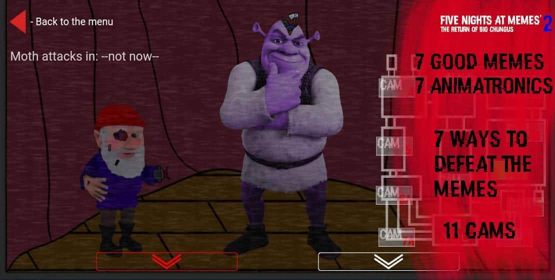 Korkutucu geceler geri döndü, ama bu sefer... meme'lerle! Karanlık bir ofistesiniz, kameralar, kapı ve havalandırmalar sizin kullanımınıza açık. Meme'lerin nerede olduğunu bilmek ve onlara mümkün olan tüm çıkışları zamanında kapatmak için sık sık gerçek zamanlı videoları kontrol edin. Her gece onların hızı artıyor, önemli olan sabah 6'ya kadar hayatta kalmak, böylece seviyeyi geçebilirsiniz. Shrek, cüce, güve, hipopotam, sizi hızlı bir ölümle korkutma anını bekliyor. Dikkat: şarj süresi sınırlıdır, bazı işlevler bununla kaybolacaktır, tasarruf etmeye çalışın.