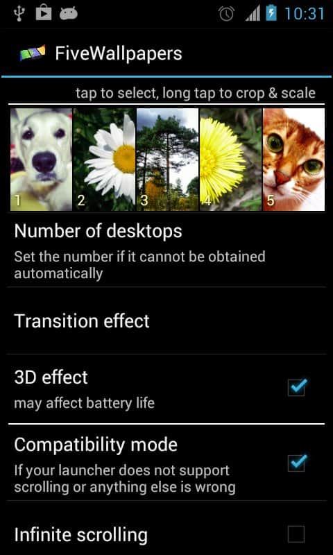 BeşDuvarKağıdı - harika bir uygulama, sayesinde kolayca her bir Android cihazınızın masaüstüne farklı duvar kağıtları yükleyip ayarlayabilirsiniz. Resimleri ölçeklendirebilir, döndürebilir, birçok farklı efekt mevcut, animasyon geçişini ayarlayabilir ve daha fazlasını yapabilirsiniz. İndirip kuruyoruz ve keyfini çıkarıyoruz.