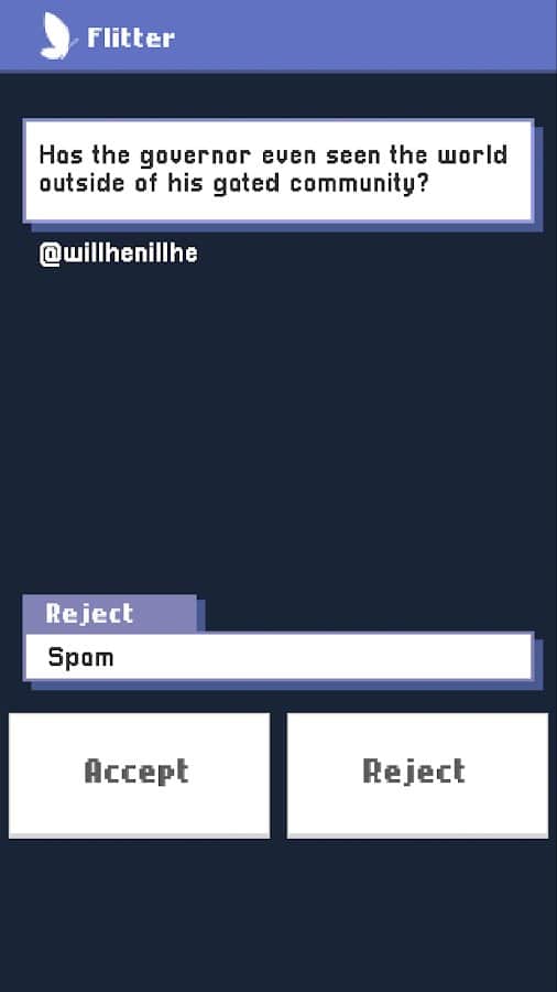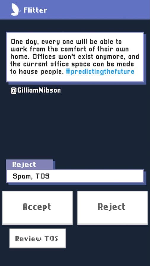 Flitter Inc. – Android için bir macera oyunu, burada 1982 yılına geri dönecek ve Flitter organizasyonunun gerçeğini keşfedeceksiniz. Bu oyunda, gezegenimizdeki yeni teknolojileri inceleyen bir şirketin çalışanı olacaksınız. Göreviniz, mikro mesaj platformunun dostça, saygılı ve spam içermediğinden emin olmaktır. İlginizden çok daha yüksek olan çıkarlar için bir makinedeki dişli gibi davranacaksınız. Sesler ve mesajlar aracılığıyla ifade edilen garip dünyayı keşfedin ve tüm sesleri takip edin. Ofiste çalışma simülasyonu yapacak oyunun tüm sırlarını ortaya çıkarın.
