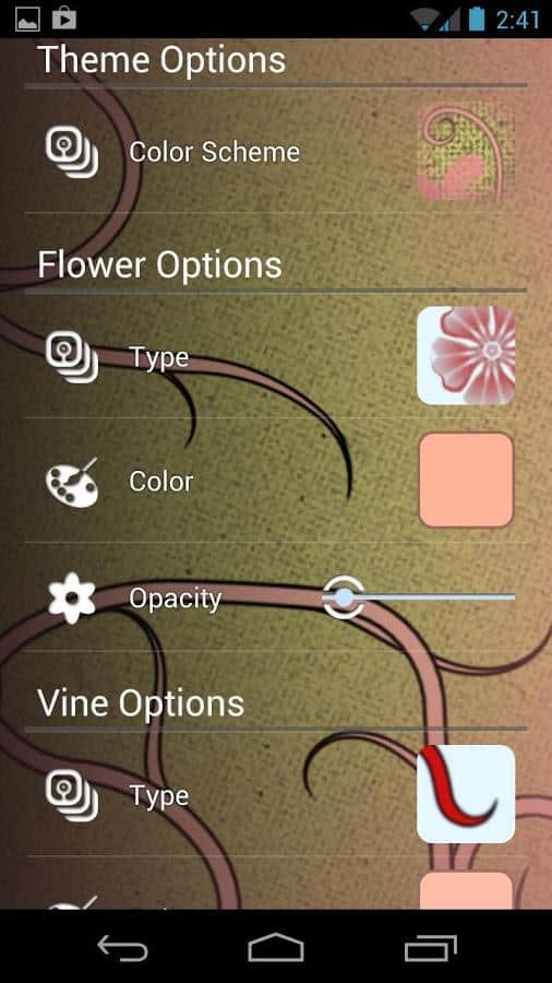 Çiçekli Sarmaşık – Android telefon veya tablet için benzersiz ve eşsiz canlı duvar kağıtları. Bu duvar kağıtlarını telefonunuza yüklediğinizde, sarmaşıkların büyümesi ve çeşitli çiçeklerin açmasıyla keyif alacaksınız. Telefonunuzu her açtığınızda rastgele gösterilecek farklı renk çözümlerini gözlemleyeceksiniz. Duvar kağıtları sanatsal bir tarzda çizilmiş olup, sonsuz bir şekilde çiçekler açmakta ve solmaktadır. Ayarlarla arka planı ve çiçekleri değiştirerek istediğiniz gibi ayarlayabilirsiniz. Bu duvar kağıtları hem telefon ekranında hem de farklı inç boyutlarındaki tablet ekranlarında harika görünmektedir.