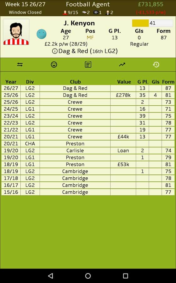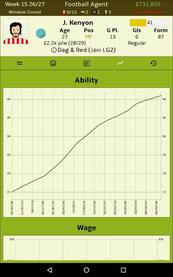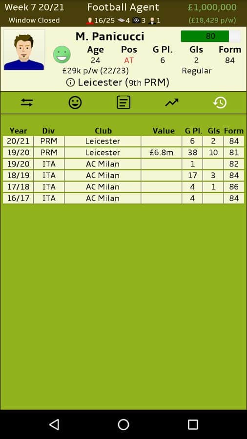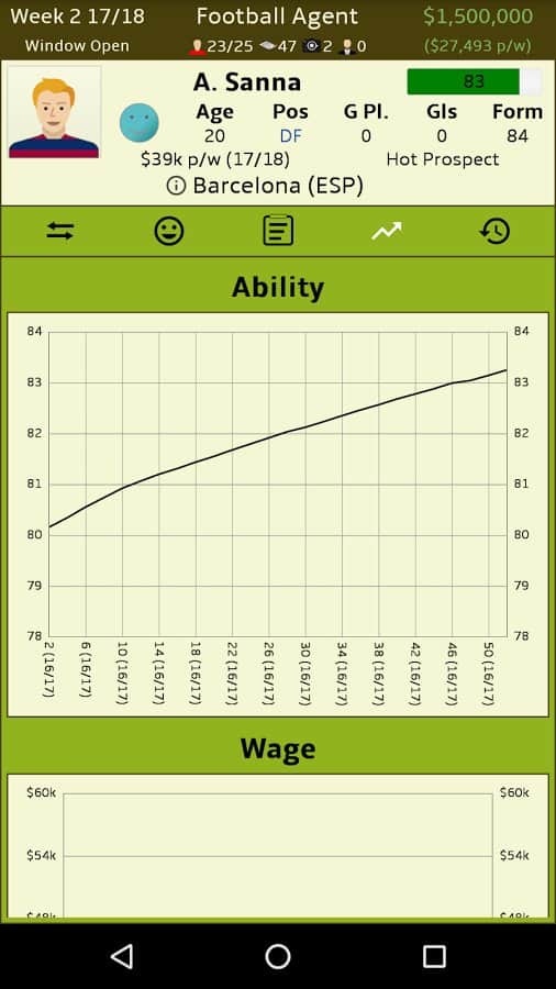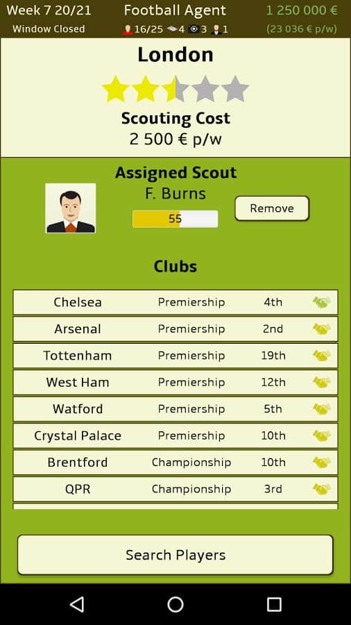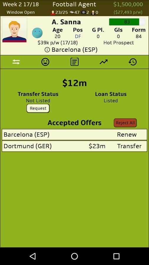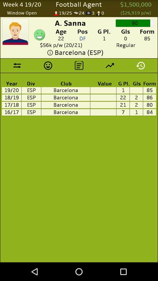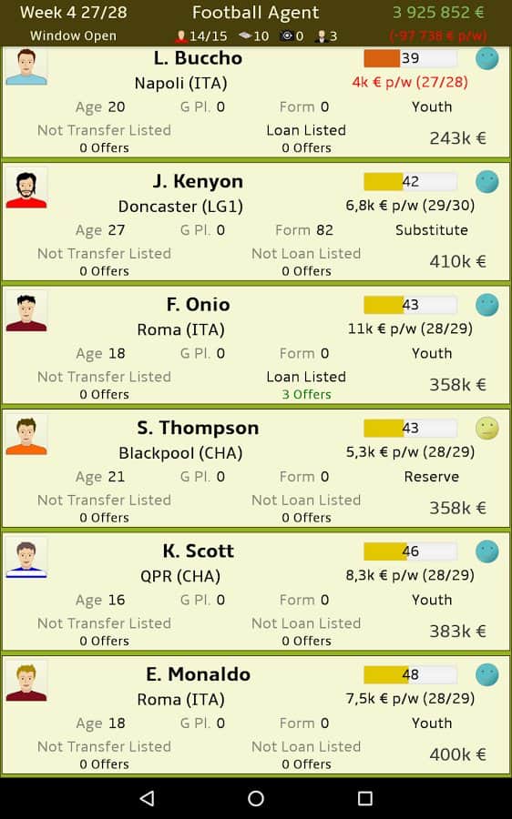 Futbol Menajeri – Android için bir simülatör, burada profesyonel bir futbol menajeri olacaksınız. Bu oyundaki ana görevleriniz, farklı futbol kulüpleri arasında kârlı anlaşmalar yapmak, futbolcuları satın almak ve satmaktır. Büyük kârlar elde edin ve çeşitli anlaşmalar yaparak işinizi geliştirin. Farklı kulüpler için potansiyelli oyuncuları arayın, gelecekteki yıldızları keşfedin ve onlardan iyi paralar kazanın. Bu oyunda futbol takımının kazanıp kazanmayacağıyla ilgilenmeyeceksiniz, sizin için önemli olan sadece kâr elde etmektir. Büyük futbol kulüpleriyle kârlı sözleşmeler yapın ve liderlik tablosunun en üstüne çıkın.