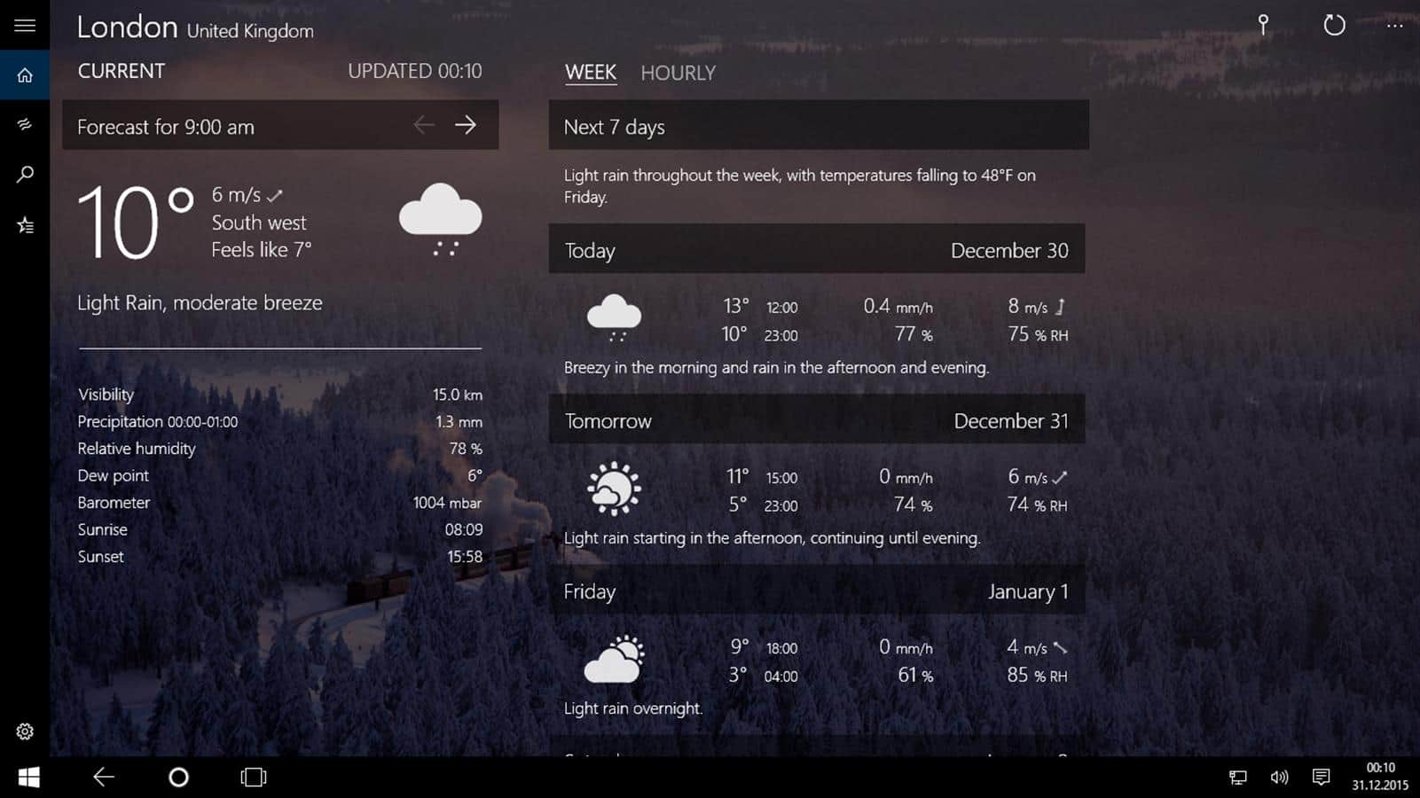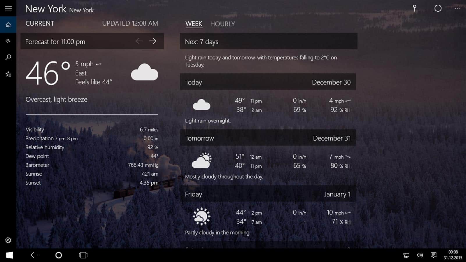 Kaliteli ve ayrıntılı hava durumu tahmini - her mevsimde iyi bir arkadaştır. Tahmin bu rol için sorun yaşamadan kullanılabilir, çünkü verileri (hava durumu sağlayıcıları Yr.no veya Forecast.io seçenekleriyle) doğruluk açısından farklılık gösterir ve arayüzü hoş bir tasarıma sahiptir.