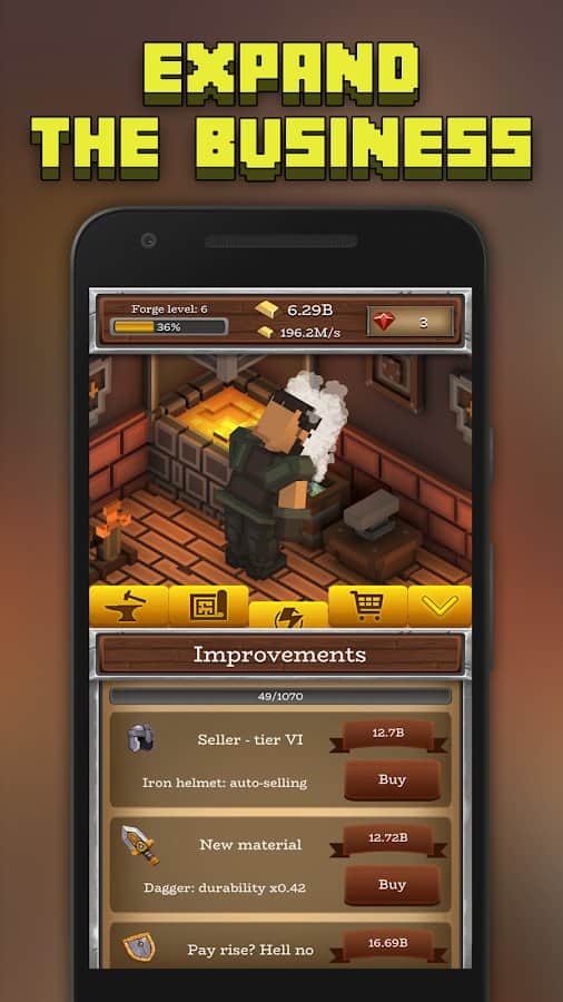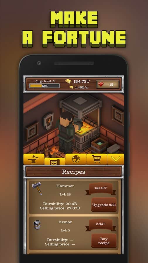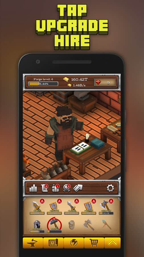ForgeCraft - Tembel Tycoon – Android'da bir demirciye yardım edeceğiniz bir tıklama oyunu. Bu oyunda ana göreviniz silahlar, zırhlar üretmek ve bununla birlikte büyük paralar kazanarak her gün daha zengin olmaktır. En büyük demirci olun ve insanların ihtiyaç duyduğu eşyaları ve silahları üretin. Telefonunuzun veya tabletinizin ekranına mümkün olduğunca sık tıklayın ve demirciyi zor işini yapmaya zorlayın. İşinizi genişletin ve geliştirerek daha kârlı ve başarılı hale getirin. Sizin adınıza birçok işi yapacak yardımcılar işe alın. Çevrimdışı modda bile para kazanın ve en iyi demirci olun.