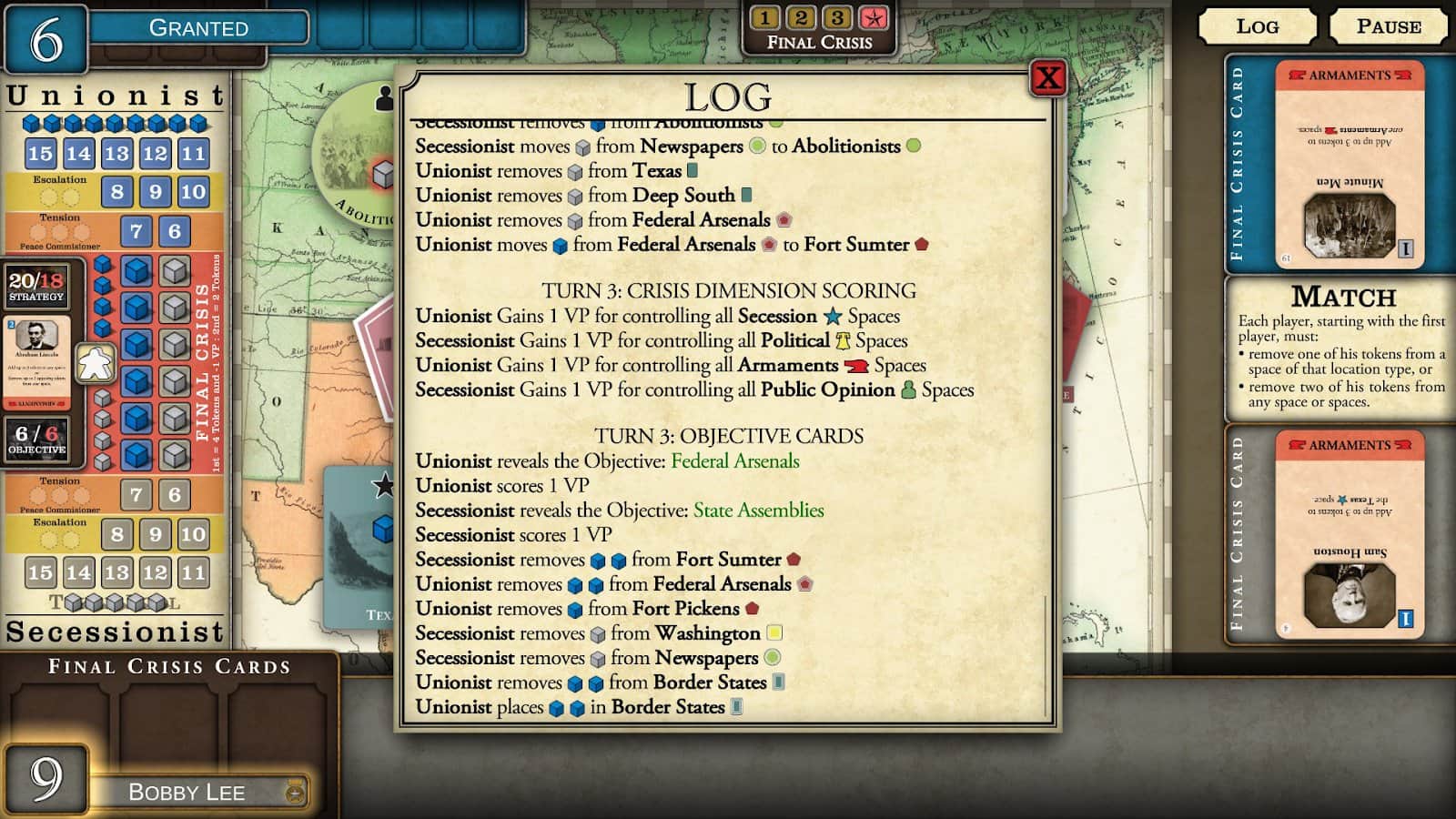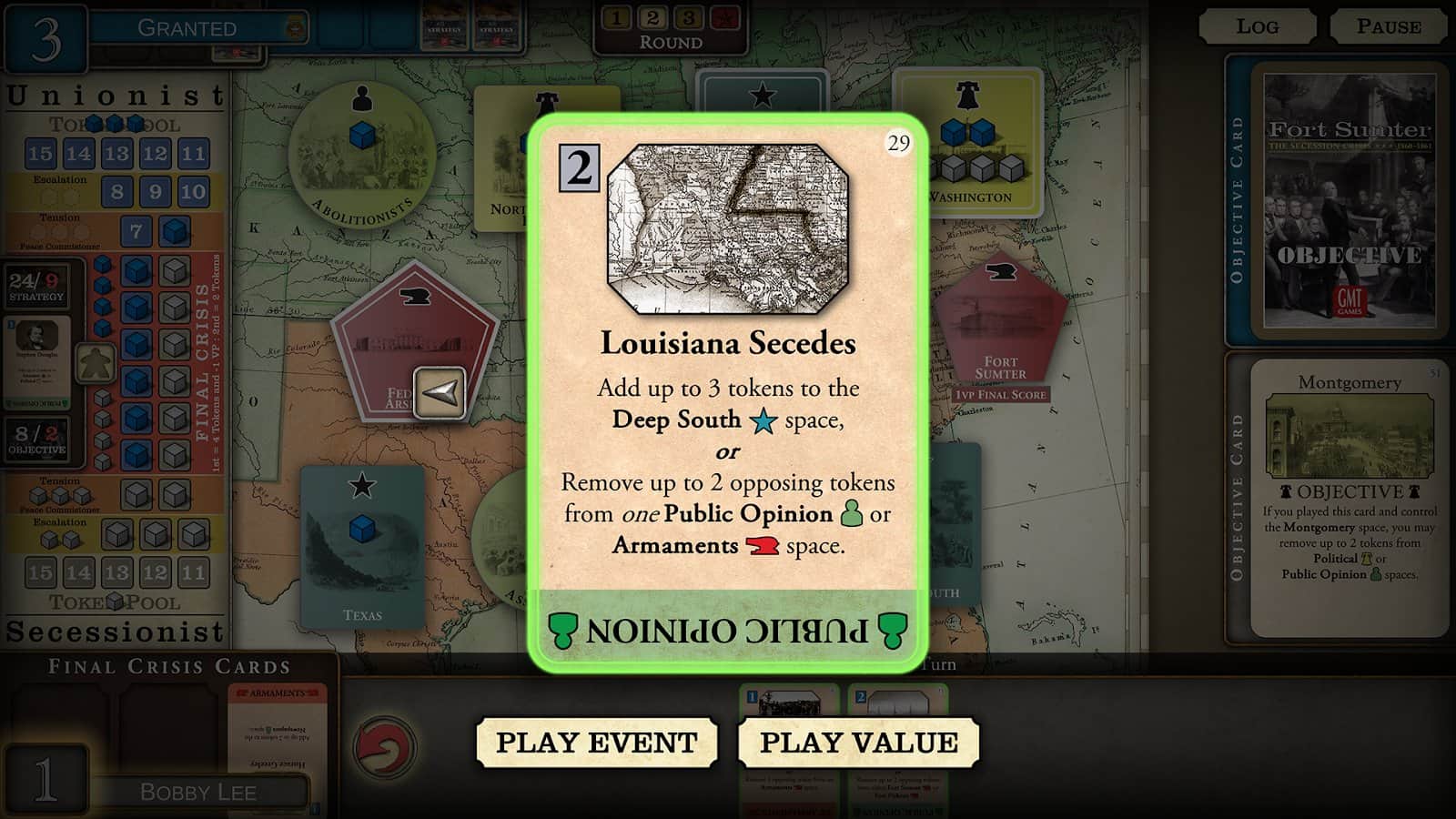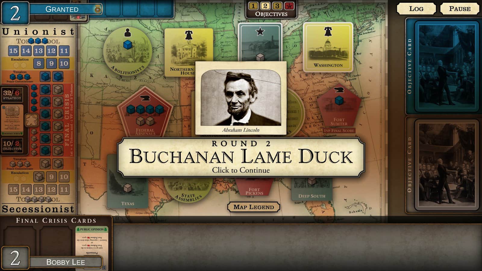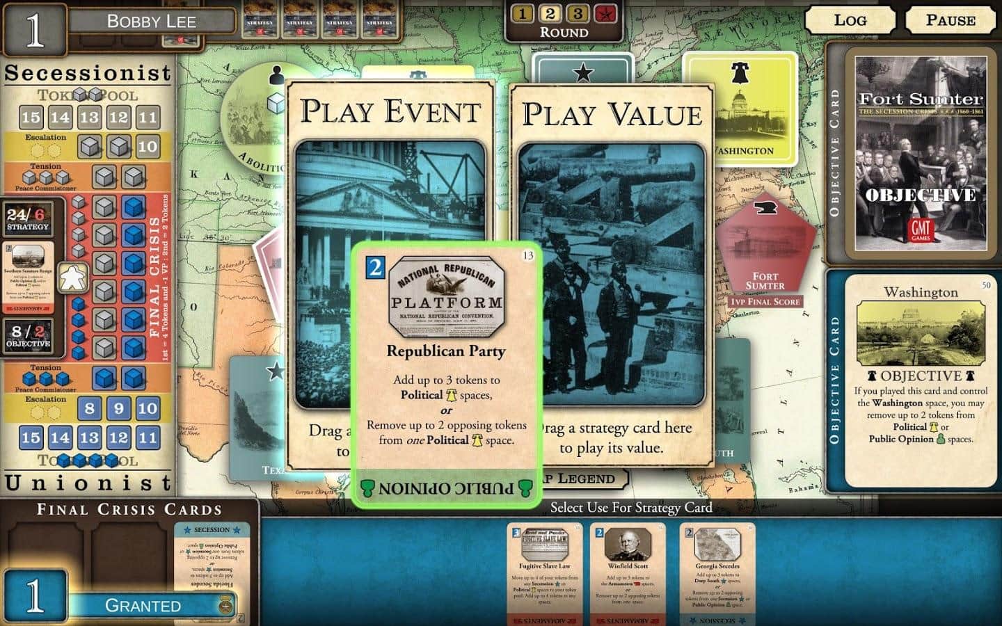 Fort Sumter: Ayrılma Krizi – iç savaşa dayanan gerçek olaylara göre yapılmış bir masa oyunu. Bu oyunda, Lincoln'a ülkenin bölünmesini durdurmasında ve dahice planını gerçekleştirmesinde yardımcı olacaksınız. Ayrılmacıları kalenin tuzağına düşürebilecek misiniz ve Lincoln'un tarihi zaferini kazanmasına yardımcı olabilecek misiniz? Eyalet haklarıyla ilgili konuları ilerletebilir ve kuzeyin görüşünü bölebilir misiniz? Bu oyunda kendi yolunuzu seçin ve deneyimli bir politikacı ve strateji uzmanı olduğunuzu kanıtlayın. Farklı eyaletlerde siyasi sermayeyi yerleştirin ve kontrol edin.