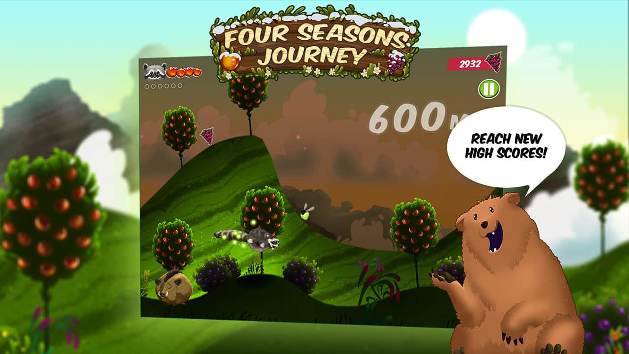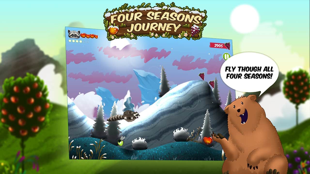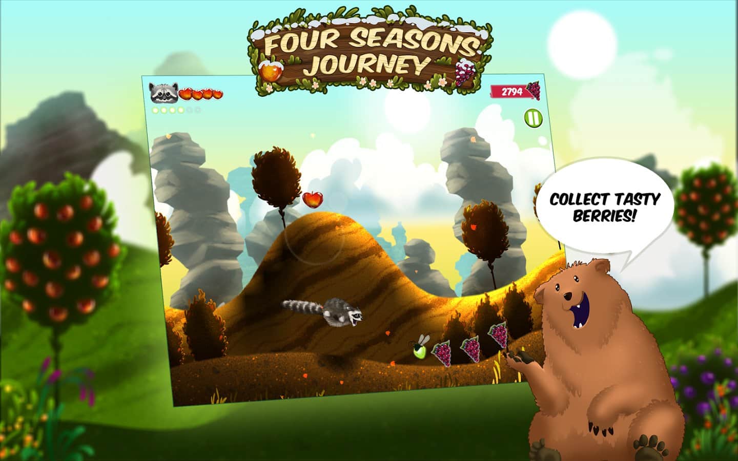 Dört Mevsim Yolculuğu – Android için bir arcade oyunu, burada bir rakunun kontrolünü elinize alacaksınız. Göreviniz, rakunun zıplaması ve tüm engelleri başarıyla geçmesi için telefon veya tablet ekranına zamanında dokunmak olacak. Kahramanınızı, sulu meyveler ve tehlikeli yırtıcı hayvanlarla dolu çeşitli dünyalardan geçirerek yolculuk yapın. Gün ve gece değişimi ile mevsimlerin tadını çıkararak, tepelerde kayarak mekanları keşfedin. Düşmandan hızla kaçmanız gerektiğinde rakunun kuyruğuna dokunun, böylece hızlanacaktır. Meyve ve faydalı bonuslar toplayın ve oyunun tadını çıkarın.