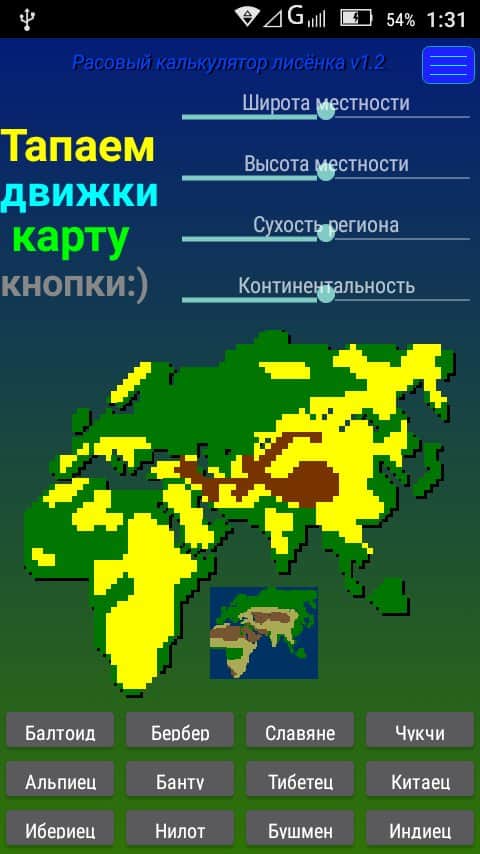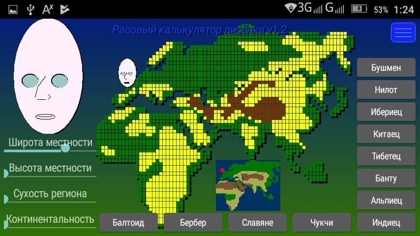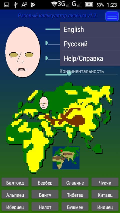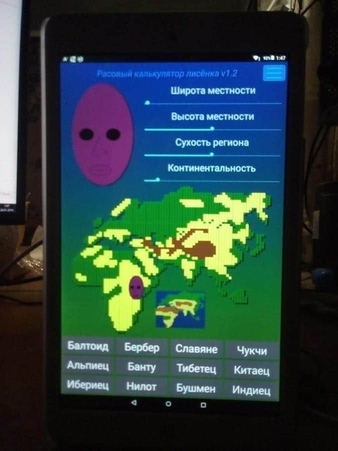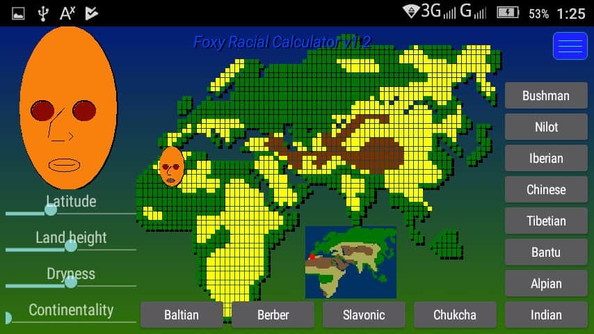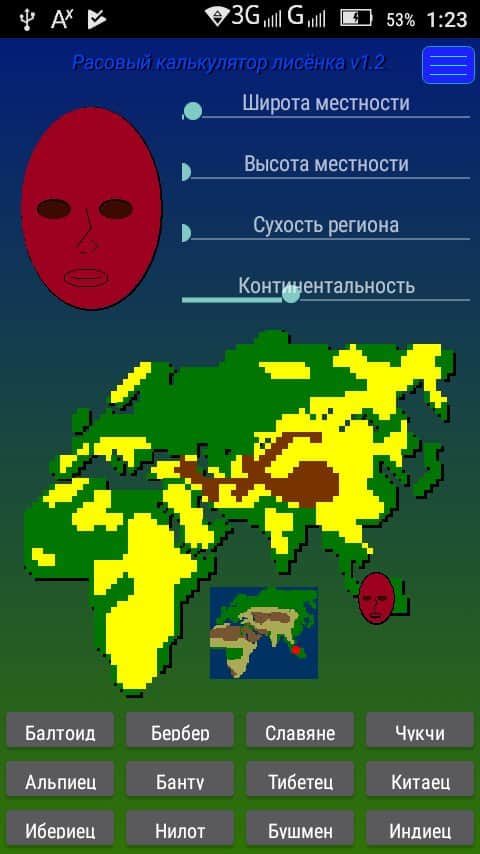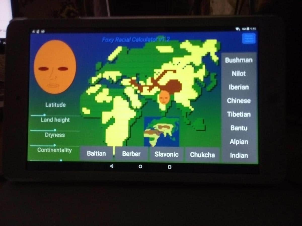Foxy ırk hesaplayıcı - insanın kafa şekli, burun, dudaklar ve gözlerin kesimi ile yaşadığı yerin iklim koşulları arasında doğrudan bir bağıntı gösterir. Belirli bir bölgede yaşayan birinin şematik portresini almak için, bu bölgenin ilgili parametrelerini ayarlamak yeterlidir. Atalarının bu bölgede ne kadar uzun süre yaşadığına bağlı olarak, sonuç daha doğru olacaktır. Eğer bazı özellikleri belirlemede zorlanıyorsanız, örneğin deniz seviyesinden yükseklik, büyük bir haritada bir yer belirlemek ya da bir milliyet seçmek yeterlidir, uygulama otomatik olarak bu sonucu belirleyecektir.