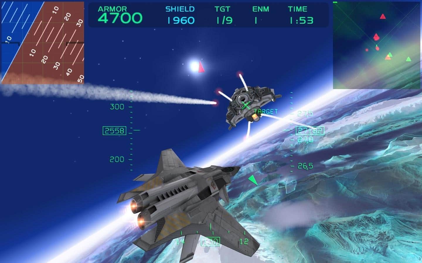 Fractal Combat X - Android için futuristik bir savaş aksiyonu, gerçek bir avcı uçağının kokpitine oturacak ve gerçek savaş görevlerini yerine getireceksiniz. Sizi yüksek kaliteli üç boyutlu grafiklerle altı farklı manzarada dinamik ve nefes kesici uçuşlar bekliyor. Oyun, iyi bir görev setine sahip ve çeşitli joystick'leri destekliyor.