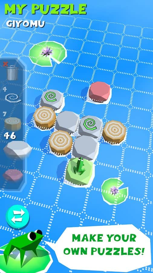 Frog Puzzle oyununda kurbağa ile birlikte eğlenceli ama zorlu bulmacaları geçin ve mantığınızı, bulmacaları tamamlama hızınızı ve algoritmalarınızı geliştirin. Göreviniz, amfibiye kırmızı taşın (finish) üzerine zıplamasına yardımcı olmaktır. Ancak her şey bu kadar basit değil: her adımı düşünmek gerekiyor çünkü tüm taşların üzerine basmalısınız. Taşların birkaç türü vardır: normal, ok olanlar (ok yönündeki sonraki adacığa yönlendirir), teleport ve zıplama (1 taş atlayarak). Her başarılı bulmaca geçişinde yeni bir seviyeye geçiyorsunuz ve 150'den fazla seviye var. Oyunda ipuçları ve harita oluşturma modu da mevcut.