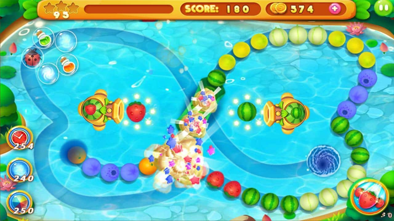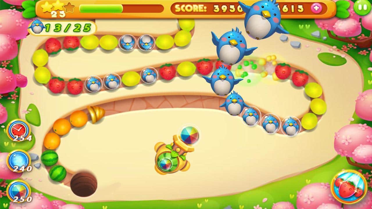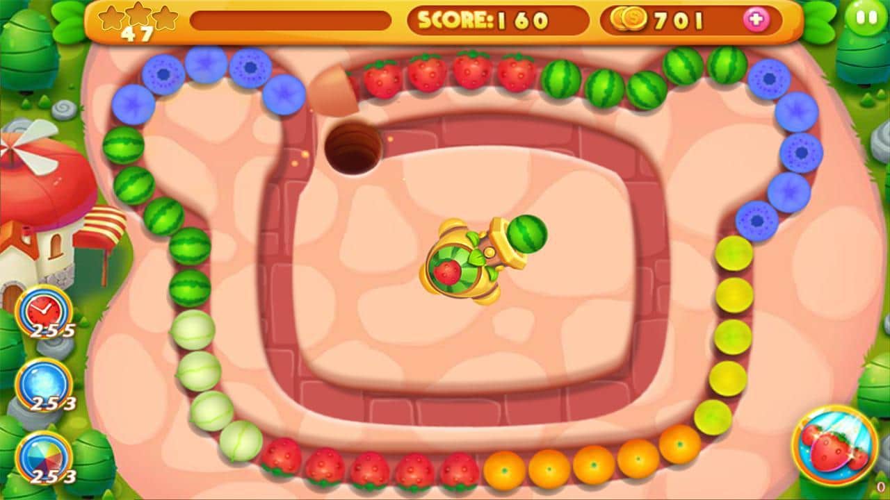 Meyve Mermer – mümkün olduğunca uzun sıralar oluşturun ve bu suları oyundan çıkarın. Bu oyunda meyveler ve böğürtlenlerden oluşan masalsı bir dünyaya gireceksiniz; burada görevimiz, renkli meyveleri hareket eden bir zincire top atarak göndermektir. Böylece mümkün olduğunca uzun bir zincir oluşturun ve onu patlatın, meyvelerin kara deliğe doğru hareketini durdurun. Meyvelerin çıkışa ulaşmasına izin vermemek için tüm zekanızı ve harika reflekslerinizi kullanın, aksi takdirde oyun sona erecek ve seviye yeniden başlayacak. Önünüzde 108 eğlenceli seviye, 6 eşsiz dünya ve meyve çıkarma görevleri sizi bekliyor.