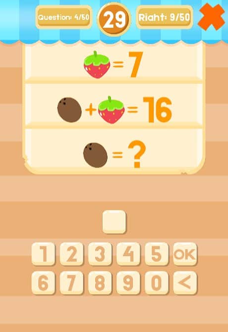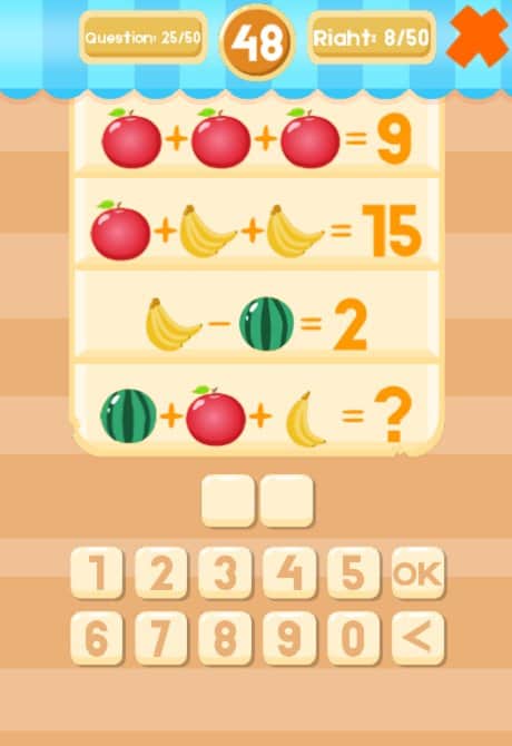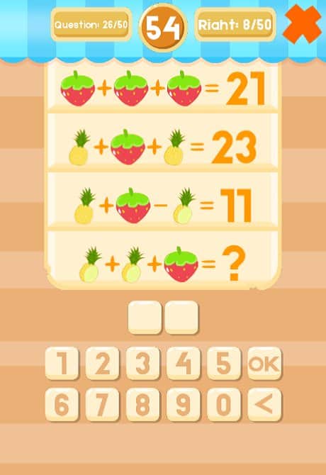 Meyve Matematiği - Android için ilginç ve eğlenceli bir bulmaca, burada zorlayıcı problemleri çözeceksiniz. Bu oyunda karşınıza çeşitli meyve örnekleri çıkacak, göreviniz bunları zihninizde çözmek ve doğru cevabı yazmak olacak. Bu oyun hem yetişkinler hem de çocuklar için uygundur, burada hızlı bir şekilde zihinsel hesaplama yapmayı ve örnekleri çözmeyi öğrenebilirler. Oyun, mükemmel canlı grafikleri, sayısız örnekleri ve görevleri ile sizi mutlu edecek, ayrıca her seviyeyi geçmek için bir kez daha kafa yormanız gerekecek. Her yeni seviyede oyunun zorluğu artacaktır.