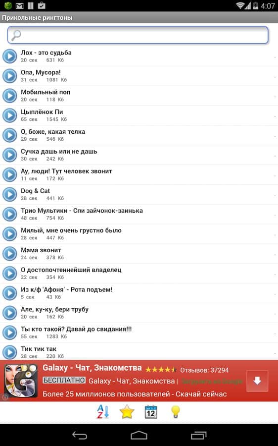 Komik zil sesleri - Android akıllı telefonunuzun en çok talep edilen özelliklerinden biri, çağrı için zil sesinin değiştirilmesidir. Bu uygulama ile kendinize yeni ve ilginç bir zil sesi seçebilirsiniz. Bunun yanı sıra, yeni bir zil sesini alarm ve SMS mesajı için de ayarlayabilirsiniz. Uygulamada çeşitli melodiler bulunmaktadır. Bunlar; ebeveynler, çocuk, patron ve diğerleri için zil sesleri temalarına ayrılabilir. Seçtiğiniz zil sesini dinleyebilir ve akıllı telefonunuzun hafıza kartına kaydedebilirsiniz. Zil seslerini istediğiniz gibi sıralayabilirsiniz. Telefonunuzu daha tanınabilir ve canlı hale getirin!