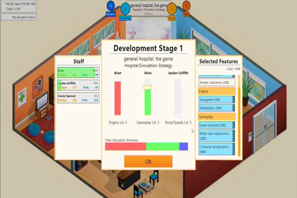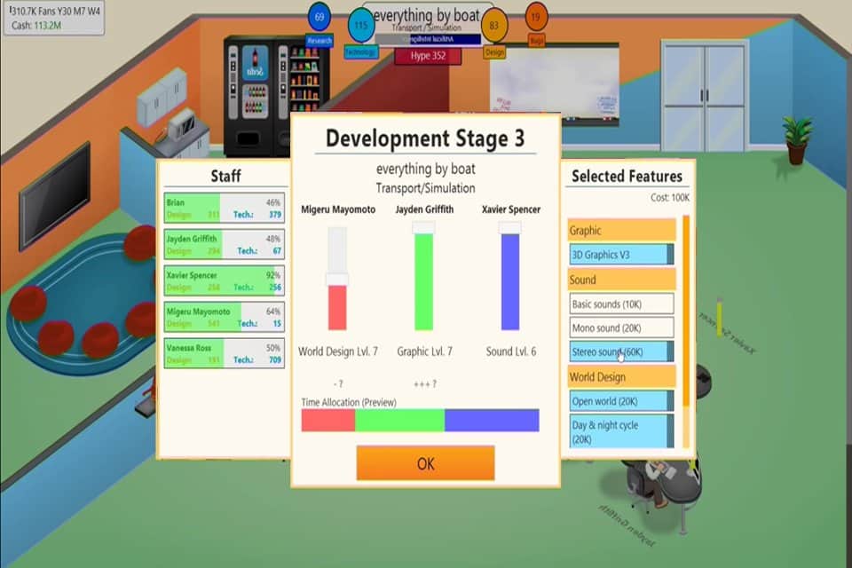 Oyun Geliştirici Yönetici Tycoon - size küçük bir oyun geliştirme stüdyosunu yönetme ve onu dünya çapında bir işletmeye dönüştürme fırsatı veren bir iş simülatörüdür. Aynı anda yüzden fazla çalışanı işe alma, onlarca şubeye sahip olma ve birçok siparişi bir seferde tamamlama imkanına sahip olacaksınız. Projenin teknik yönlerinin yanı sıra, Game Dev Manager Tycoon'un bir ekonomik strateji olduğunu da göz önünde bulundurarak ekonomik unsurları dikkatlice takip etmelisiniz.