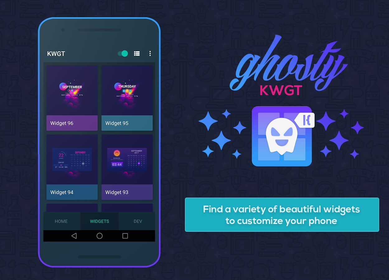 Ghosty KWGT - bu uygulamada ihtiyacınız olan tüm widget'ları bulacaksınız ve bunlar standartlardan farklı olarak harika tasarımı ve profesyonel çizimi ile dikkat çekecek. Harika bir takvim mi istiyorsunuz, lütfen! Eğer masaüstünüz stil eksikliği çekiyorsa, widget'ların temasına uygun olarak arka planınızı değiştirebilirsiniz. Seçenekler gerçekten çok fazla ve sürekli olarak yenileniyor.