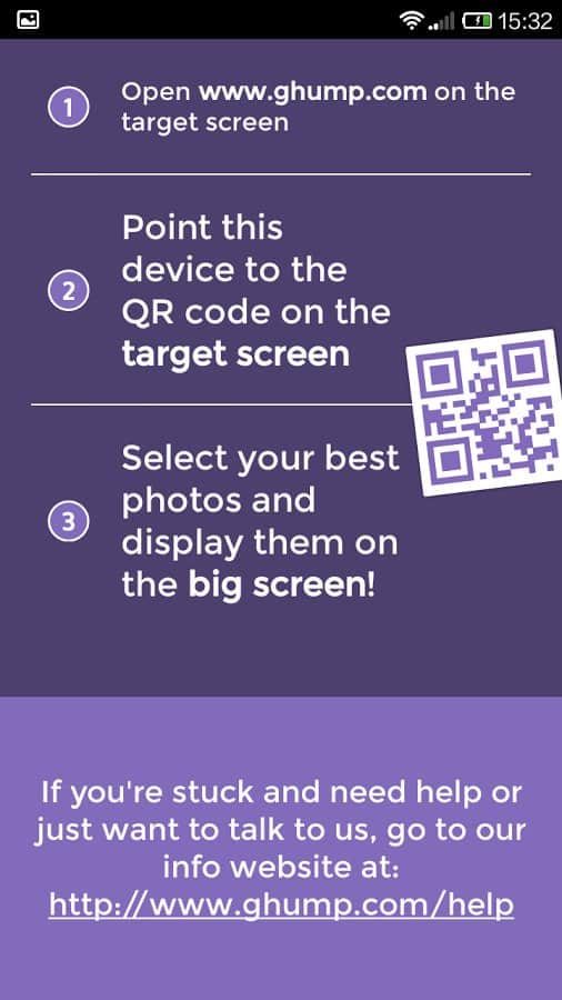 Bilgisayardan http://www.ghump.com hizmetinin web sitesine giriyorsunuz, akıllı telefonda uygulamayı başlatıyorsunuz ve cihazlarınızı bağlayacak QR kodunu okutturuyorsunuz. Daha sonra ilgilendiğiniz fotoğrafları seçebilir veya hepsini gösterebilirsiniz. Galeri gösterimi akıllı telefondan kontrol edilir, ayrıca tam ekran moduna geçebilir ve görüntüleri ölçeklendirebilirsiniz.