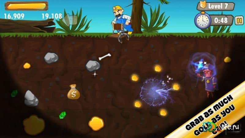 Altın Madencisi Efsanesi – değerli taşlar ve altın toplama üzerine Android için eğlenceli bir oyun. Bu oyunda altın madenciliği çağında yer alacak ve cesur bir adama altın çıkarmasında yardımcı olacaksınız. Hedef alın ve büyük bir altın nugget veya değerli taşı yakalamak için vinçinizi fırlatın. Bir seviyeyi geçmek için belirli bir miktar değerli metal ve elmas çıkarmanız gerekiyor. Her yeni seviyede oyunun zorluğu artacak ve yer altına çeşitli engeller ve kötü varlıklar eklenecek. Kazandığınız altınla kendinize ek ekipman alın ve vinçinizi geliştirin.