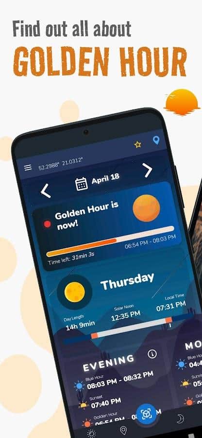 Fotoğraf tutkunları, doğru pozlama ve mükemmel aydınlatma için güzel bir şekilde tasarlanmış bir proje. Proje, sözde “altın saat” zamanını ve açısını sergilemek amacıyla ana bir hedef taşırken, aynı zamanda diğer günler için de kullanılabilir. Hava durumu, bulutlar, yağışlar, açı, parlaklık, gölgeler ve daha fazlası, bir araya getirilmiş bir set içinde, planlarınızı gerçekleştirmek için uygun yeri belirlemenize yardımcı olur. Bu program, sadece fotoğrafçılar ve sanatçılar için değil, tamamen farklı hedefleri, görevleri ve ilgi alanları olan insanlar için de faydalıdır.