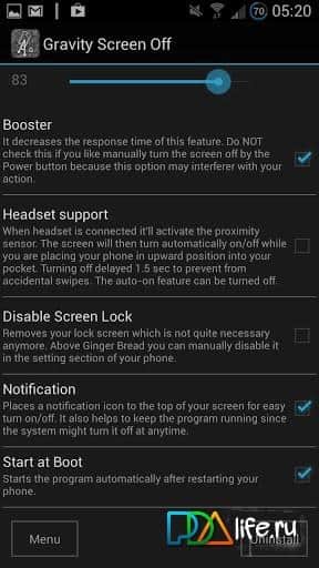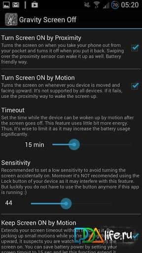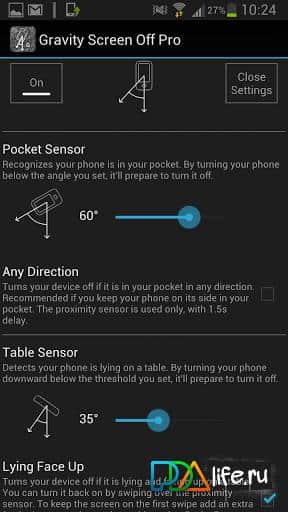 Yerçekimi Ekranı Kapat – Plexnor geliştiricisinden Android cihazınız için iyi ve yararlı bir program. Yerleşik konum sensörü sayesinde, akıllı telefonun belirli bir pozisyonda ekranın açılıp kapanmasını ayarlayabilirsiniz. Pil tüketimi – minimumdur.