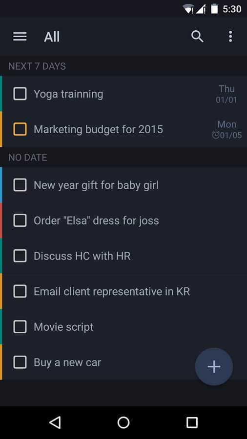 GTasks: Todo List & Task List - Bu uygulama, aktif bir yaşam tarzına sahip insanlar için gerçekten vazgeçilmezdir, ya da birçok iş toplantısı veya diğer işler olanlar için. Bu sadece görevlerinizi kaydetmekle kalmaz, aynı zamanda onları gruplara ayırır ve belirlenen zaman dilimlerinde ve farklı yollarla size hatırlatır. Bunu senkronize edebilir ve görev listenizi PC'den bile görüntüleyebilirsiniz. Çok yönlü bir hatırlatıcı, basit ve kullanıcı dostu bir arayüze sahip.
