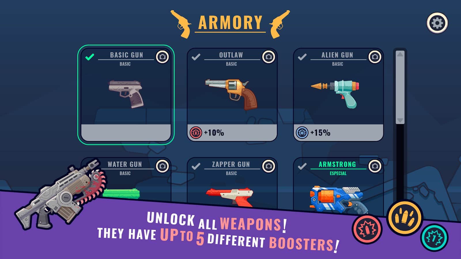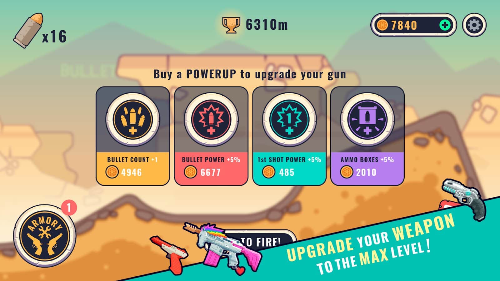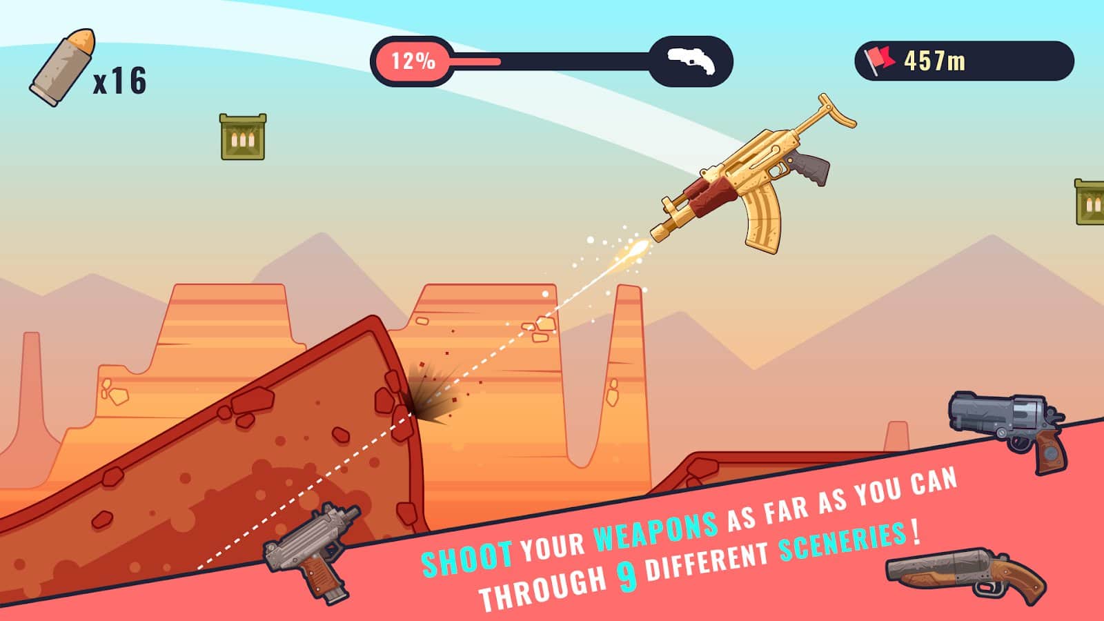 GunSpin - Eğer belirli bir mesafeyi, normal bir silah kullanarak geçmeniz gerekiyorsa ne yapacaksınız? İleride mermileriniz tükenecek, bu yüzden sürekli olarak bunları yenilemeniz gerekiyor, böylece daha fazla ödül kazanmak için kendi yolunuza devam edebilirsiniz. Oyunda 9 aşama, seçim için 18 farklı silah var, bunların çoğu ile tanışmak için belirli bir zaman harcayın. Yönü seçin, yere ateş edin ve kazandığınız paralarla silahınızı geliştirin.