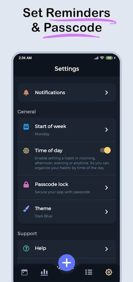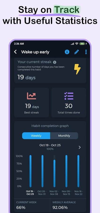 - Alışkanlıkların birden fazla görüntüleme modu: kartlar, listeler, takvim, grafikler;