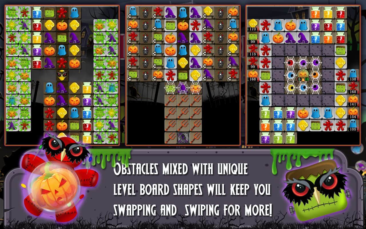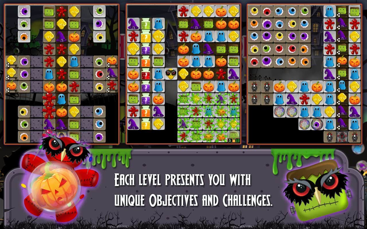 Cadılar Bayramı Damla 4 - Üç eşleştir bulmaca – Cadılar Bayramı temalı üç eşleştir türünde bir oyun. Bu oyunda, üç veya daha fazla nesneden oluşan sıralar oluşturmanız gerekecek, birçok zorluğun üstesinden gelerek. Her yeni seviyede, zorlukların ve engellerin sayısı artacak ve oyunu daha karmaşık hale getirecek. Zaman ya da hamle sayısı bitene kadar tüm zorlukları geçin. Küçük problemleri çözün çünkü belirli bir zorluğu geçmek için mantığınızı ve zekanızı kullanmanız gerekecek.